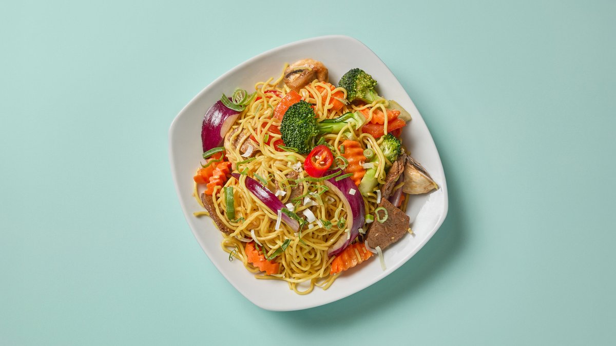 Klassisk wok med spenstige gule eggnudler, woket med saftig vegetarbiff. Toppes med dagens sprø grønnsaker og vendes i vår egen smakfulle woksaus. Enkelt, balansert og utrolig godt.
