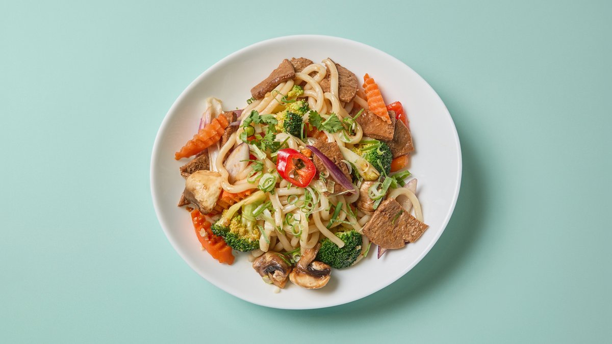 Fyldig og smaksrik rett med tykke udon-nudler og saftig vegetarbiff. Hver porsjon tilberedes med et nøye utvalg av dagens ferskeste grønnsaker og løftes av vår egen krydrede woksaus som binder smakene sammen.