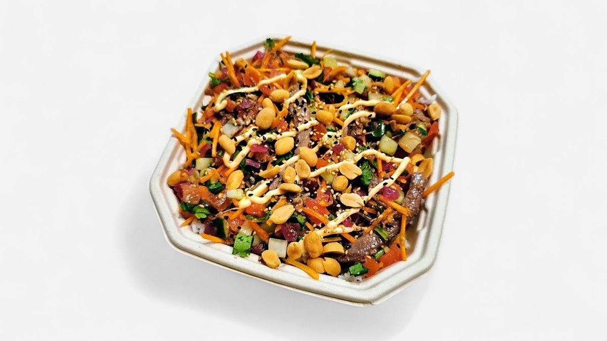 Poke med pulled beef, gulrot, tomat, vårløk, koriander, chilimayo, peanøtter, sesamfrø, ris, agurk, syltet rødløk og vietnamesisk saus