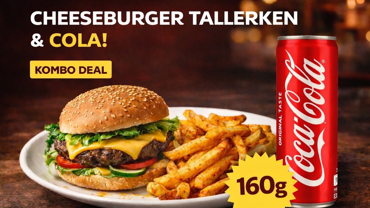 Burger Brød, 160 g okse burger filet, Cheter ost, Hjemmelagt burger dressing, salat og pommes frits ved burger.