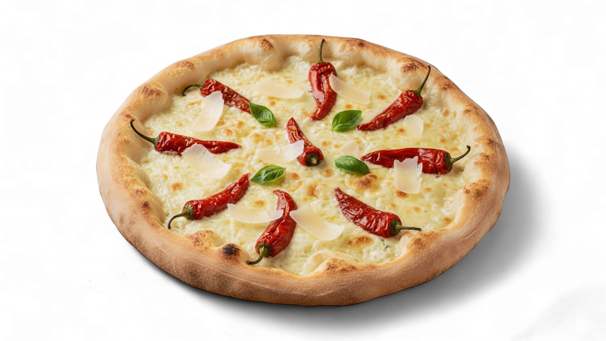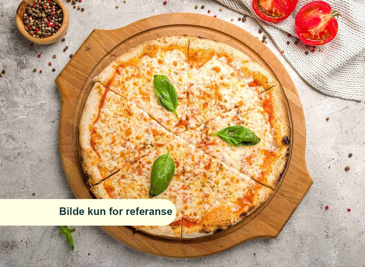 Pizza med tomatsaus, parmesan , gauda ost, mozzarella ,oliven ojle . Til og med et valgfrit dressing gratis.