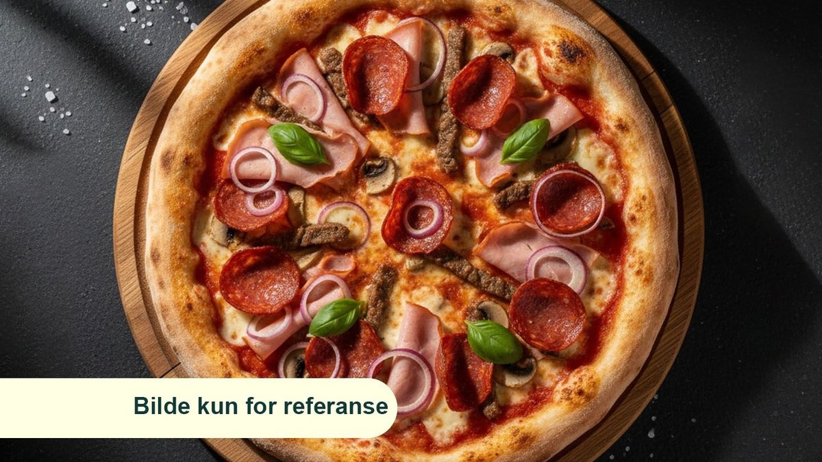 Pepperoni, skinke, biffkjøtt, løk, sopp. Til og med et velgfrit dressing ; )