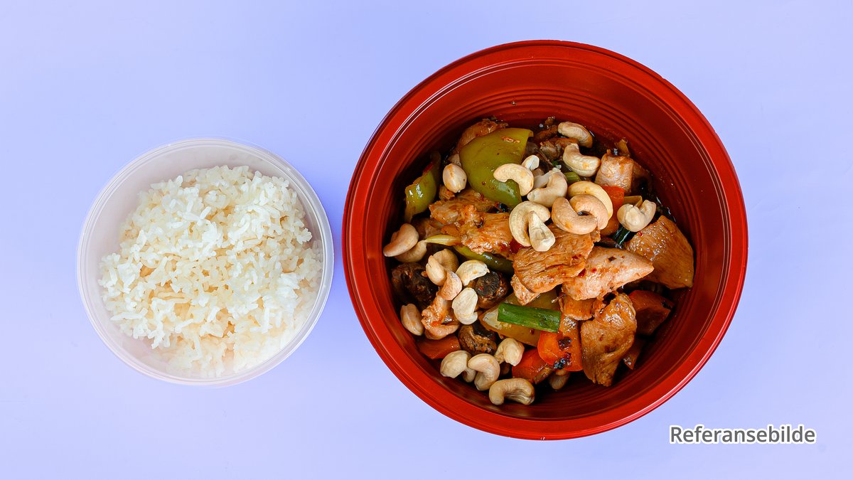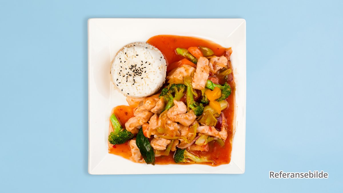 Med sursøtsaus løk, bambusskudd, sopp, paprika, gulrøtter. Serveres med ris