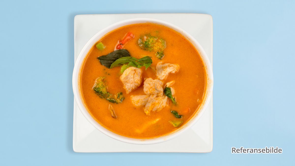 Rød karrisaus med grønnsaker og kokosmelk. Serveres med ris.,