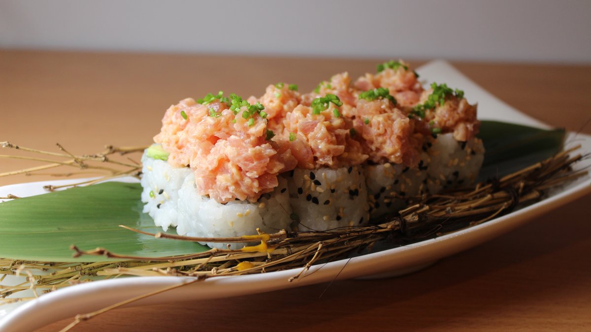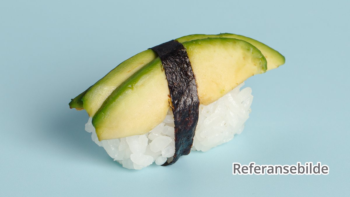 8 biter. Kokt scampi, avokado, laks tartare, flyvefiskrogn, vårløk og teriyaki saus
