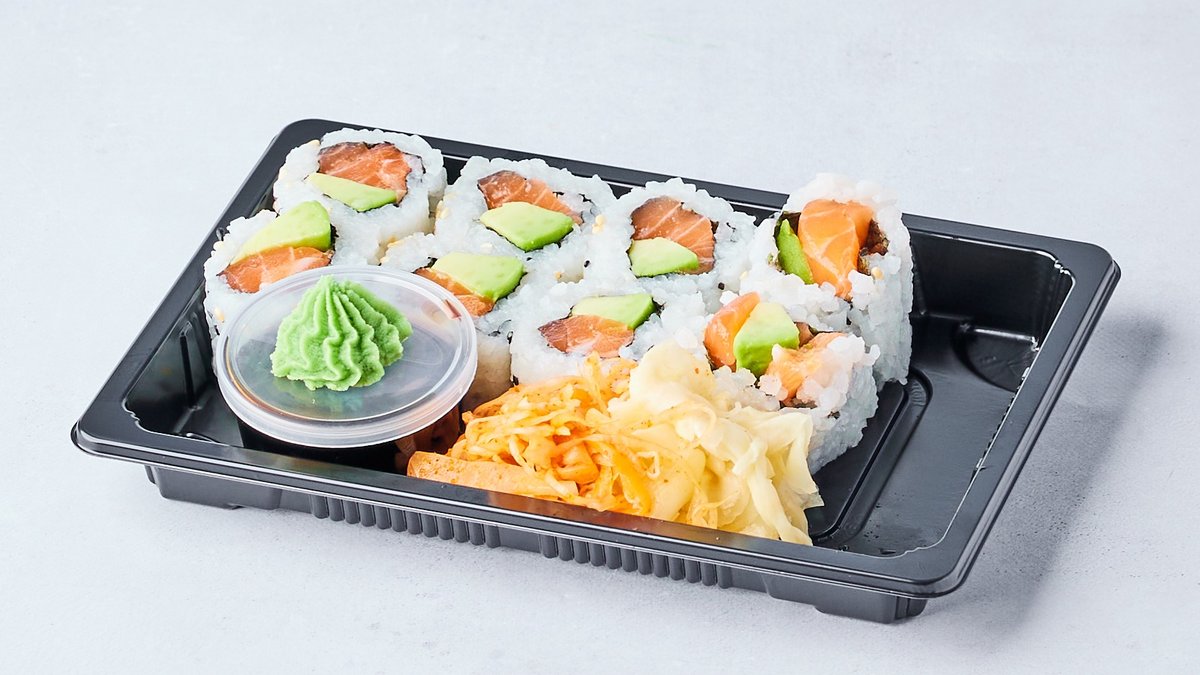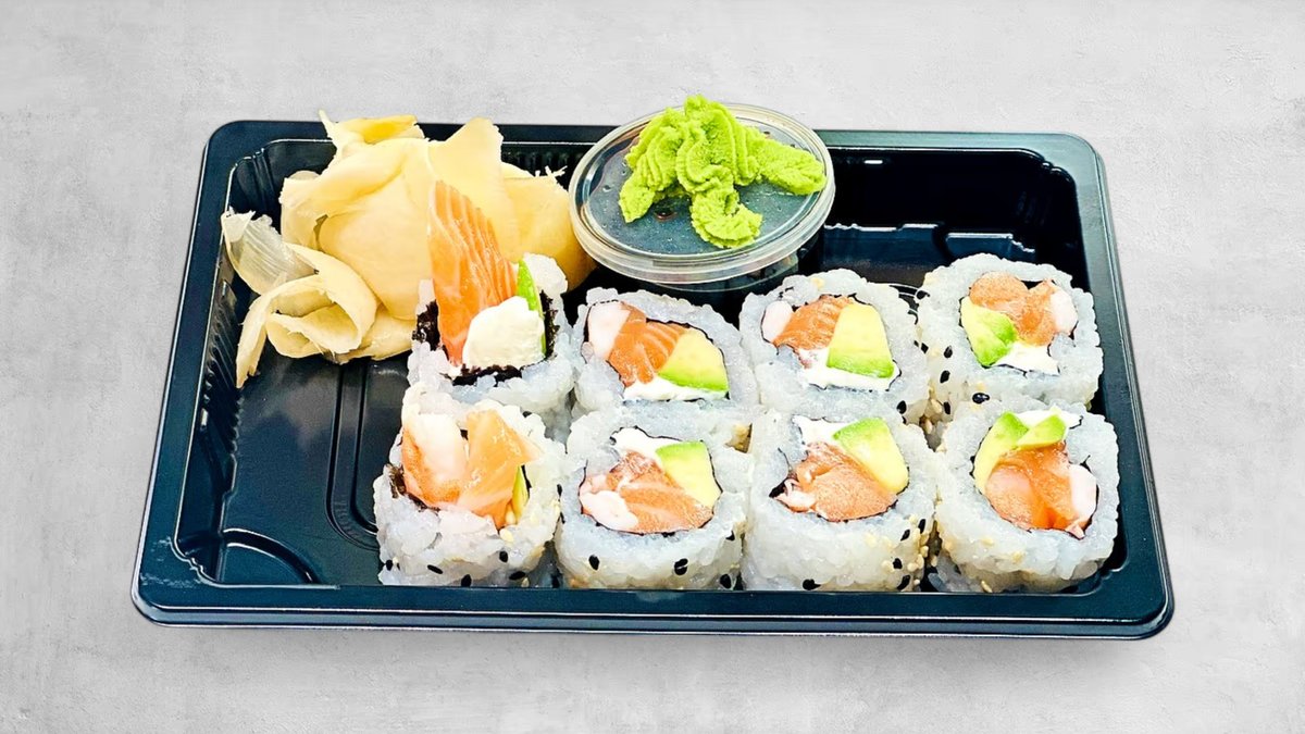 8 biter. Maki med avokado, agurk, philadelphia ost, toppet laks