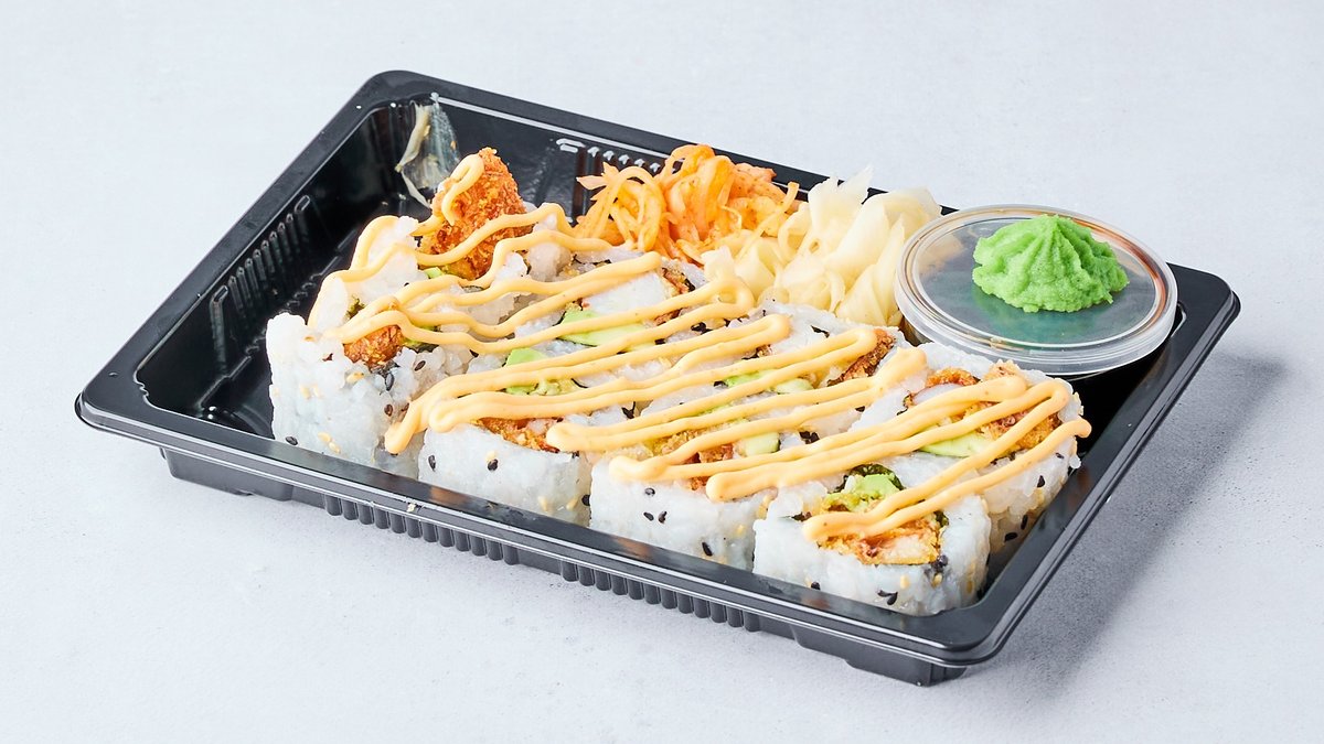 8 biter. Fritert kylling, crabsticks mix, toppet med flyvefiskrogn, avokado og teriyakisaus
