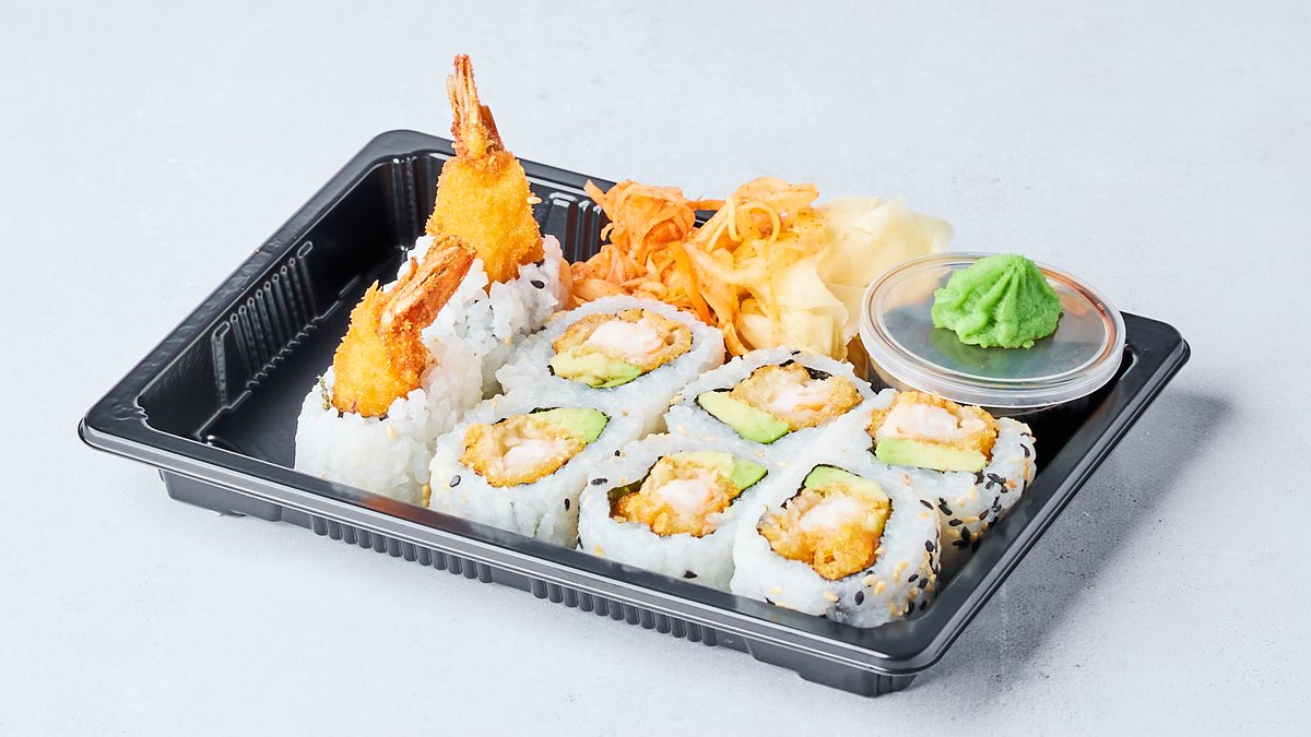 14 biter: 6 biter laks nigiri, 8 biter tempura scampi maki