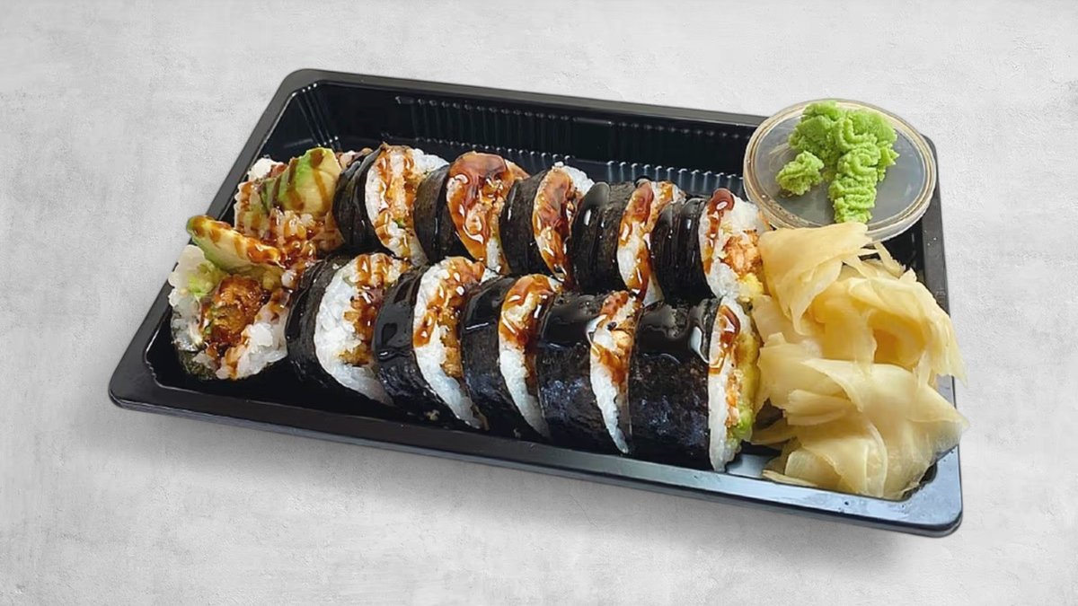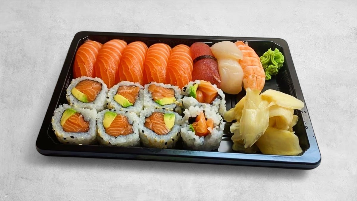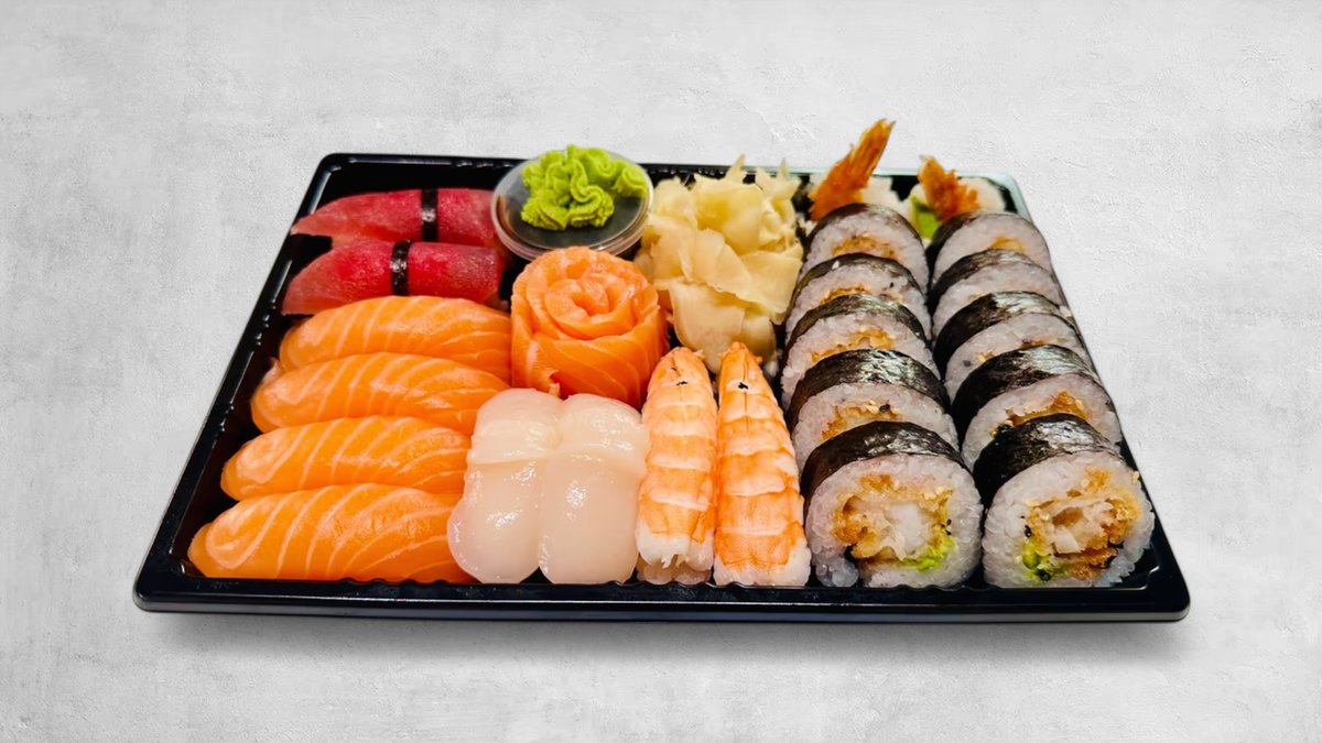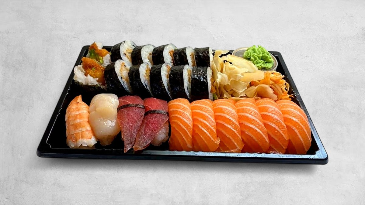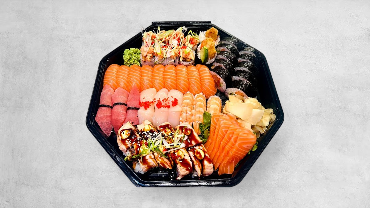 Nigiri: 12 Laks, 12 Flambert Laks, 4 Scampi, 4 Tunfisk, 4 Kamskjell, Maki: [2 Special Maki - 16 biter], 6 fritert laks hele ruller, 6 fritert scampi hele ruller Sashimi: 8 Laks