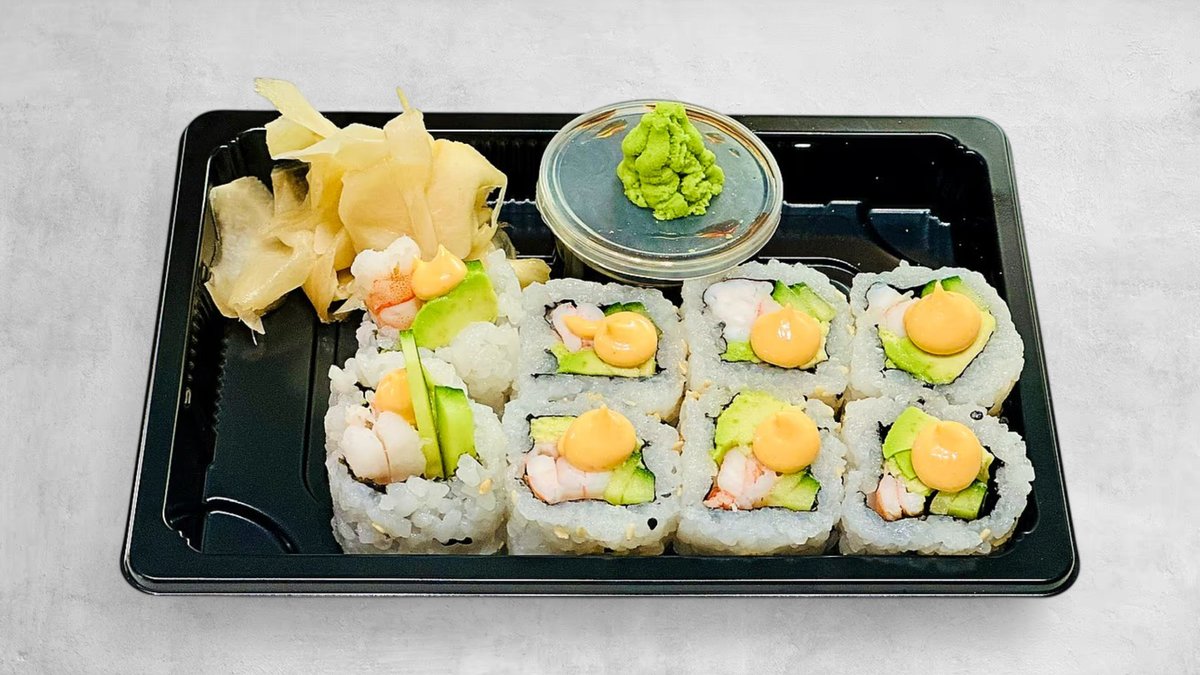 8 biter. Kokt reker, agurk, avokado, chilimajones, flyvefiskrogn