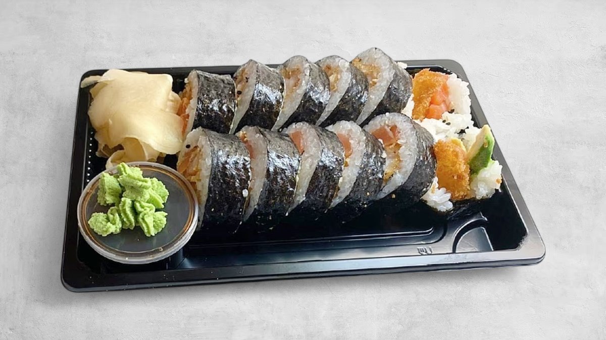 16 laks nigiri, 6 crispy laks maki, 6 kylling futo maki, 2 fritert laks med kimchi agruk philadelphiost, teriyakisaus, 2 tempura scampi med crabstick futomaki med avocado