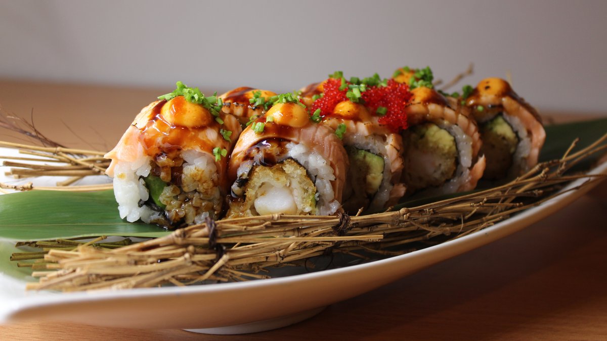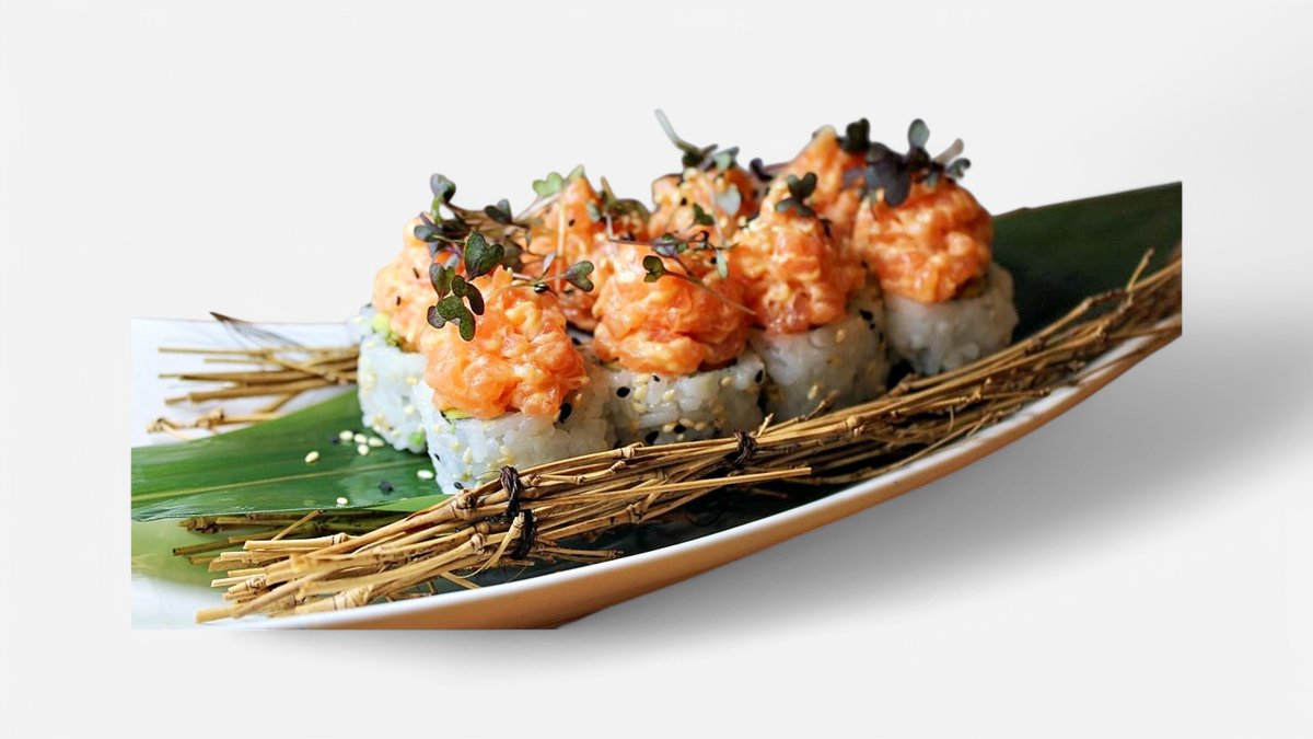 8 biter. Fritert scampi, avokado, laks tartare, flyvefiskrogn, chilimajones og vårløk