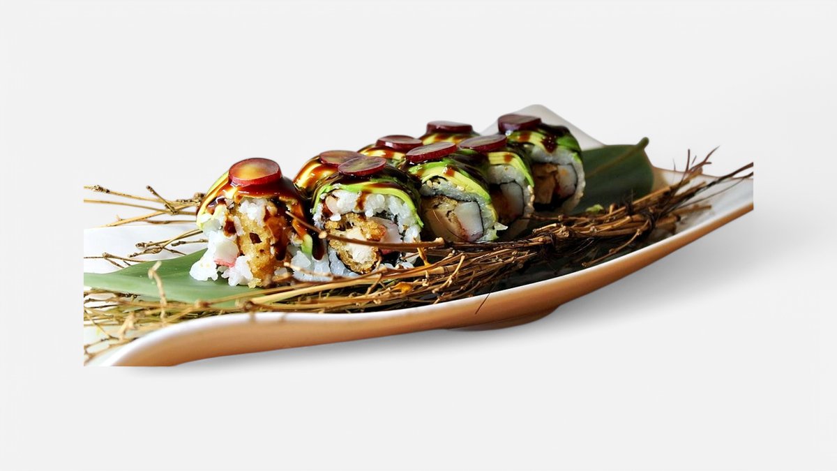 12 Biter: Fritert Laks, avokado, Vårløk, Teriyakisaus, philadelphiaost