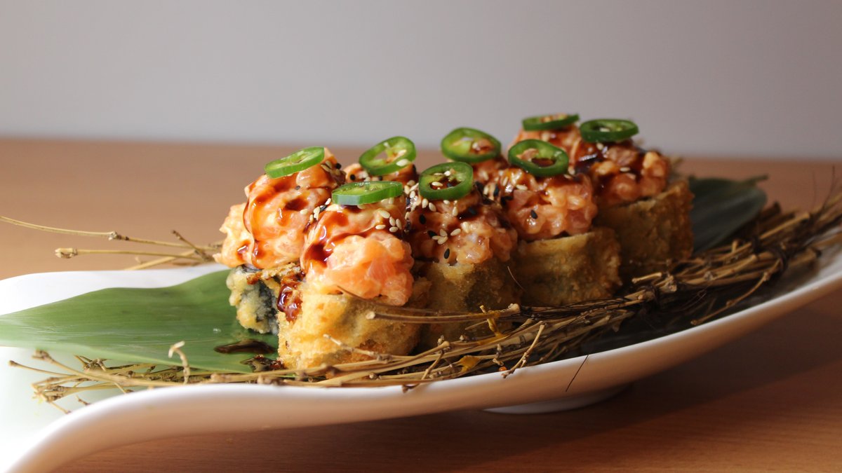 8 biter. Fritert laksmaki med avokado, vårløk, chilimajones