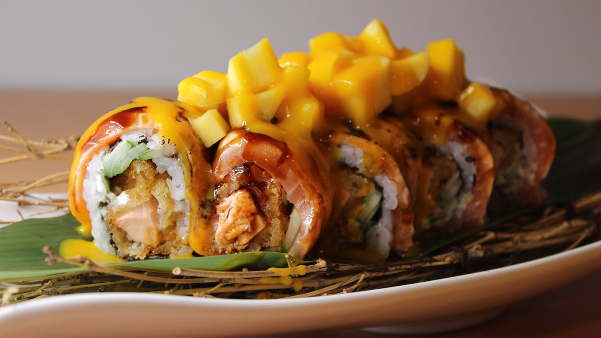 8 biter. Fritert laks, agurk, mango, philadelphia, toppet med laks, teriyaki saus