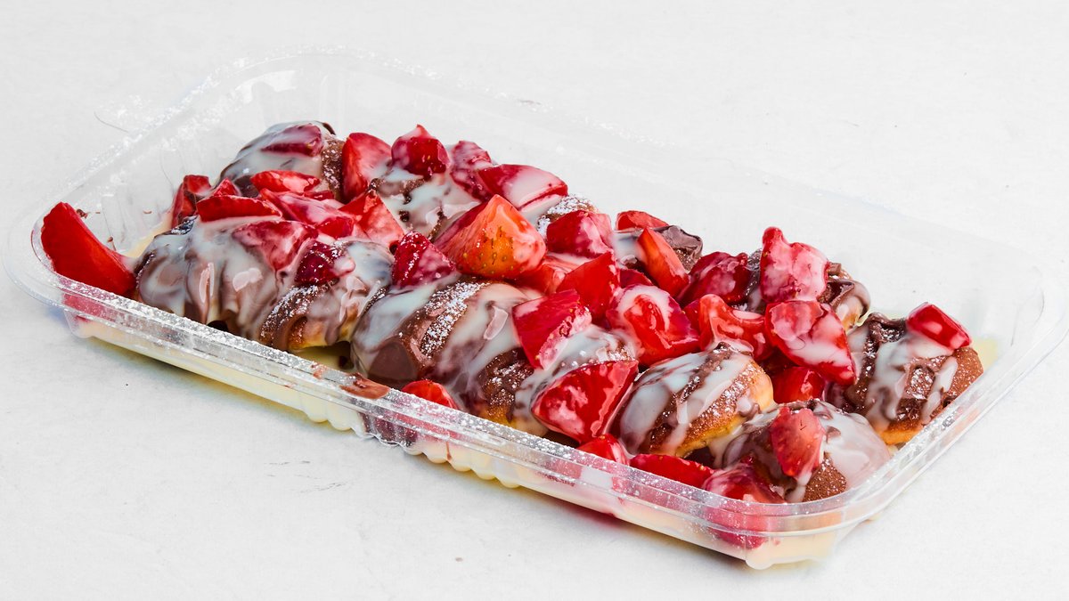 Toppet med jordbær, hvit sjokolade- saus og Nutella- saus