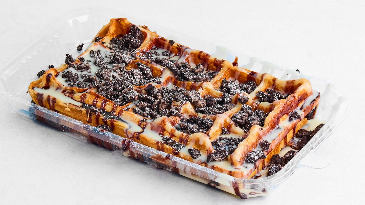 Toppet med knuste Oreo- kjeks, hvit sjokolade- saus og sjokolade- saus.
