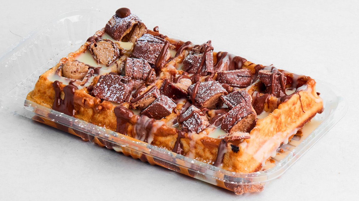 Toppet med Kinder Bueno- sjokolade, hvit sjokolade- saus og Nutella- saus.
