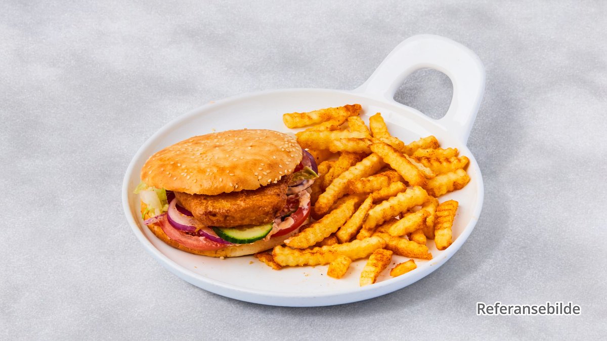 Serveres med hvitløksdressing. Velg mellom rull og tallerken med fries.