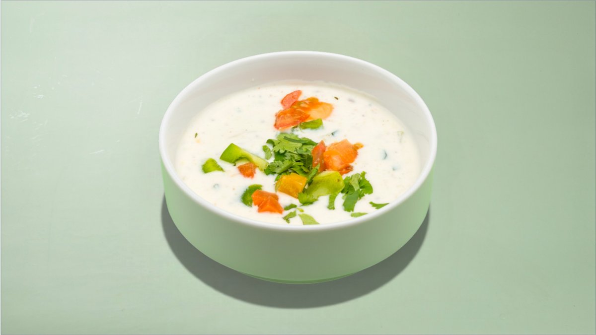 Benfritt lammegryte med ris, purreløk, cashewnøtter og rosiner. Serveres med raita.