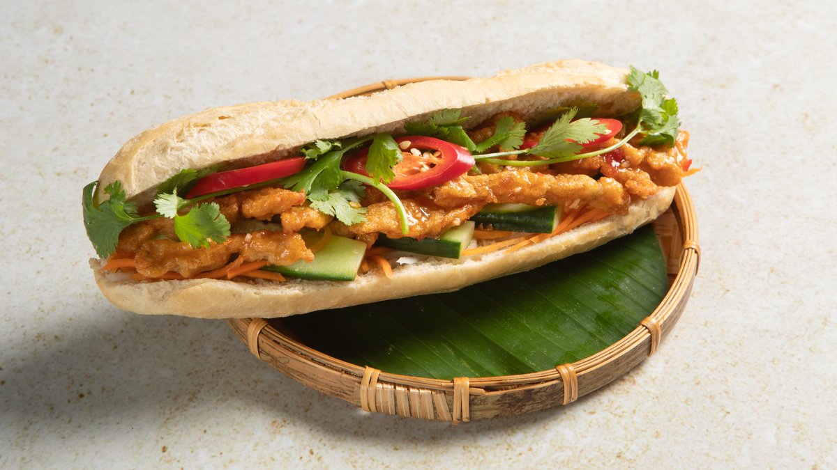 Vietnamesisk baguette med grillet marinert kylling, syltede gulrøtter og reddik, koriander, agurk og majones.