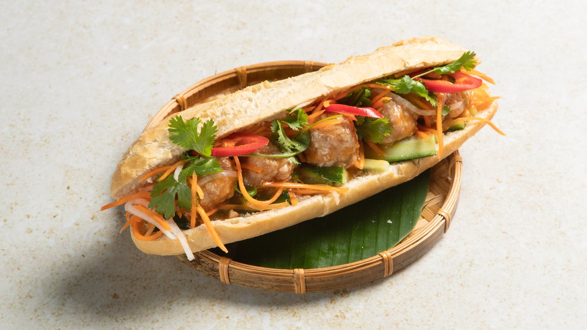 Vietnamesisk baguette med xiu mai-kjøttkaker, syltede gulrøtter og reddik, koriander, agurk.