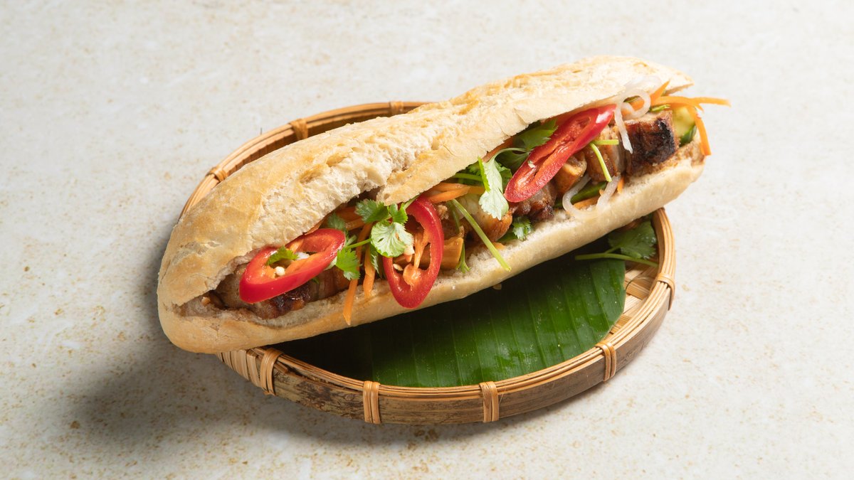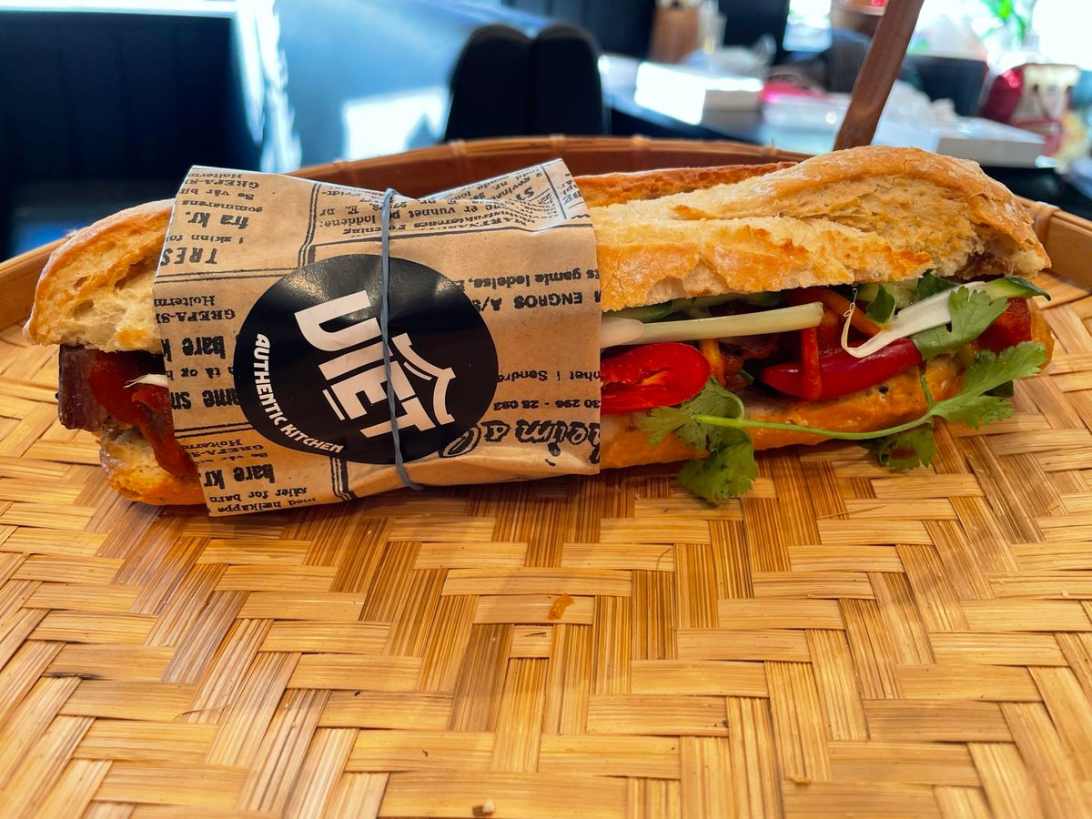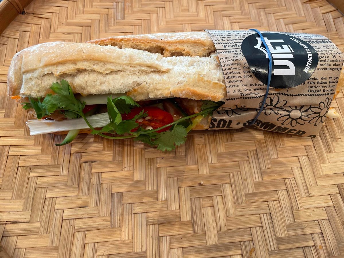 Vietnamesisk baguette med marinert svinekjøtt (xa xiu), vietnamesisk pølse, pâté, syltede gulrøtter og reddik, koriander, agurk og majones.