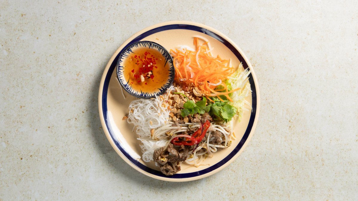 Vietnamesisk salat med marinert biff, sitrongress, risnudler, salat, syltede gulrøtter og reddik, urter, chili. Toppet med nøtter og fritert løk. Følger med hjemmelaget fiskesaus.