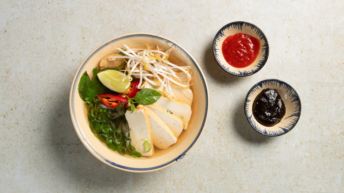 Risnudler, skiveskåret tofu, løk, bønnespirer, vegetarisk buljong servert med asiatiske urter.