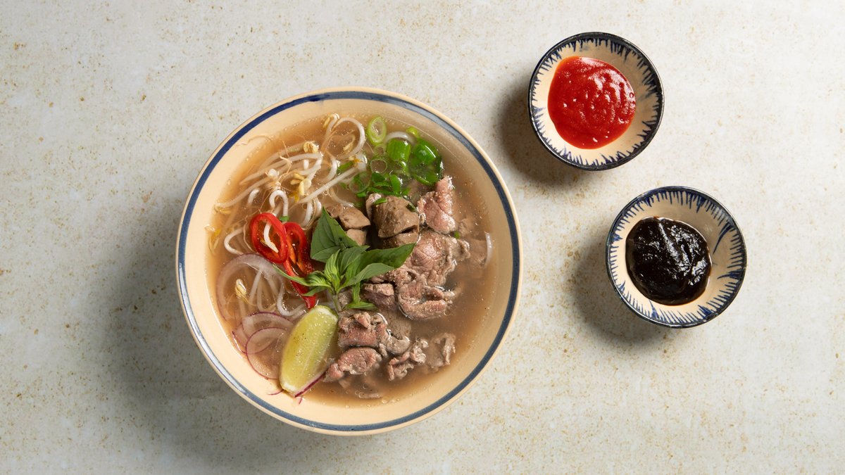 Risnudler, tynt skåret oksefilè, løk, bønnespirer, oksekjøttbuljong servert med asiatiske urter.