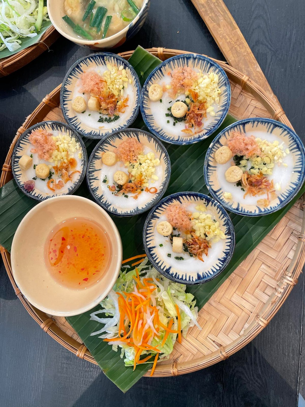 Dampet riskake, sopp, svinekjøtt, fritert løkolje, asiatiske urter. Serveres med hjemmelaget fisksaus-chilisaus for dipping.