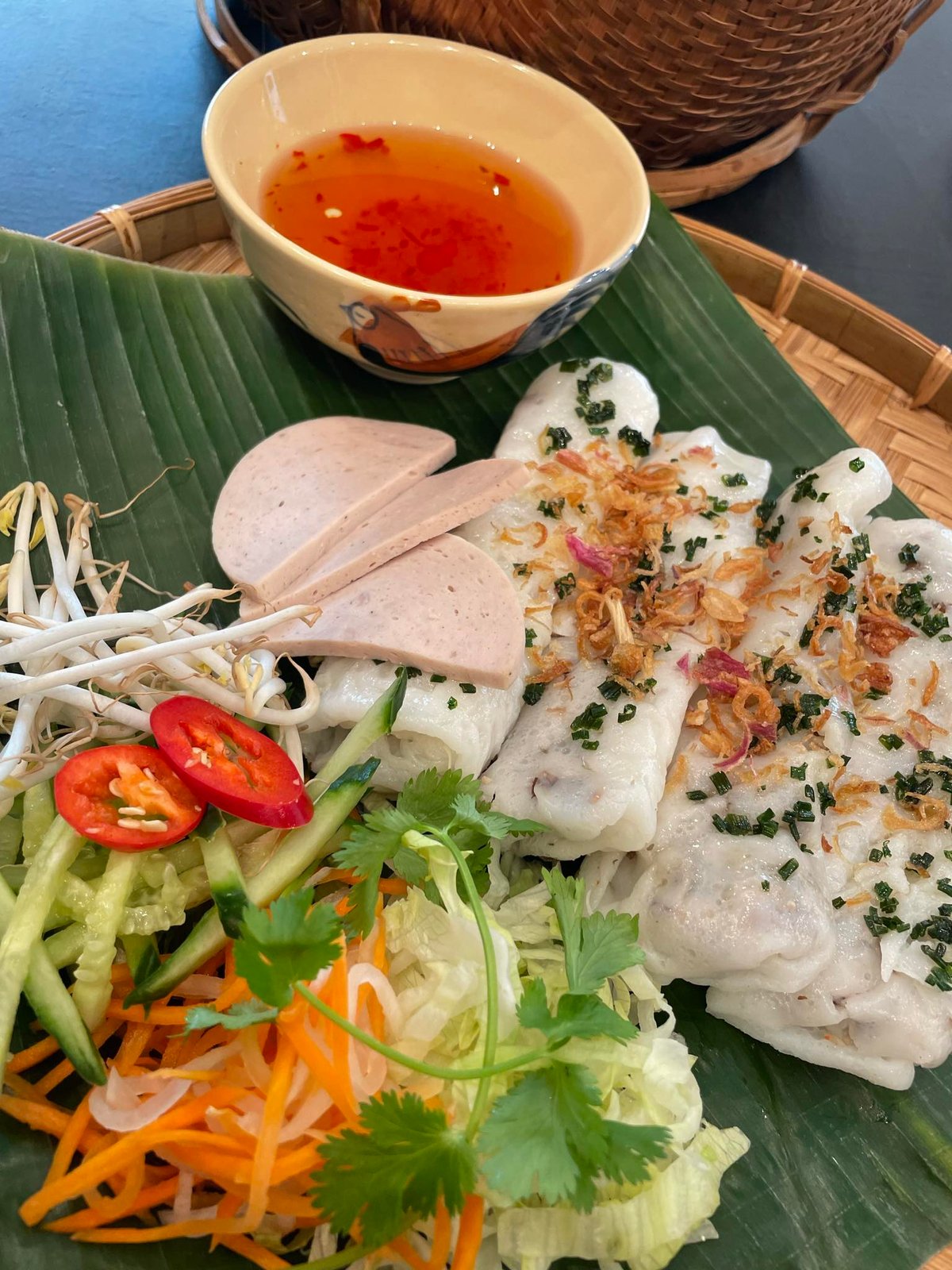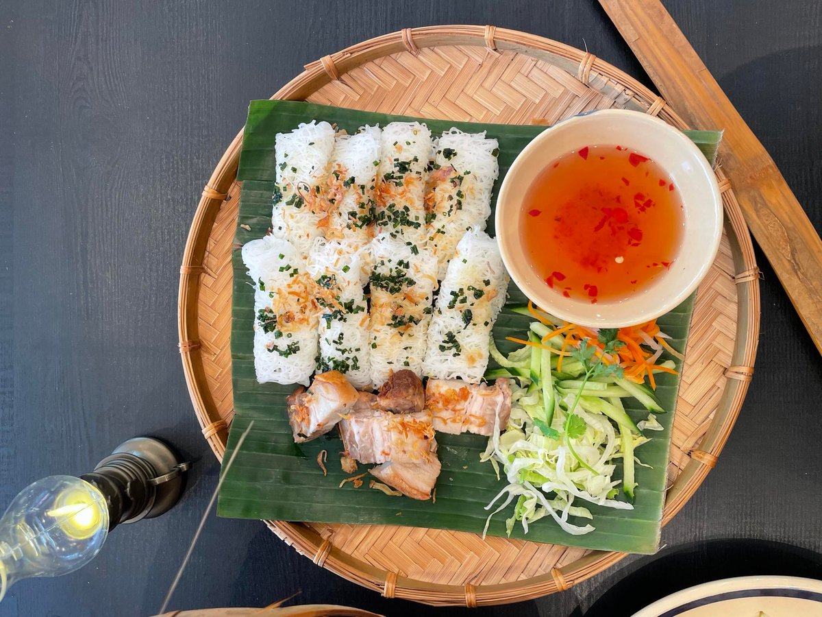 Tynne rismelark, sprøstekt svinekjøtt, salat, urter, peanøtter, friterte løk. Serveres med hjemmelaget fisksaus-chilisaus for dipping.