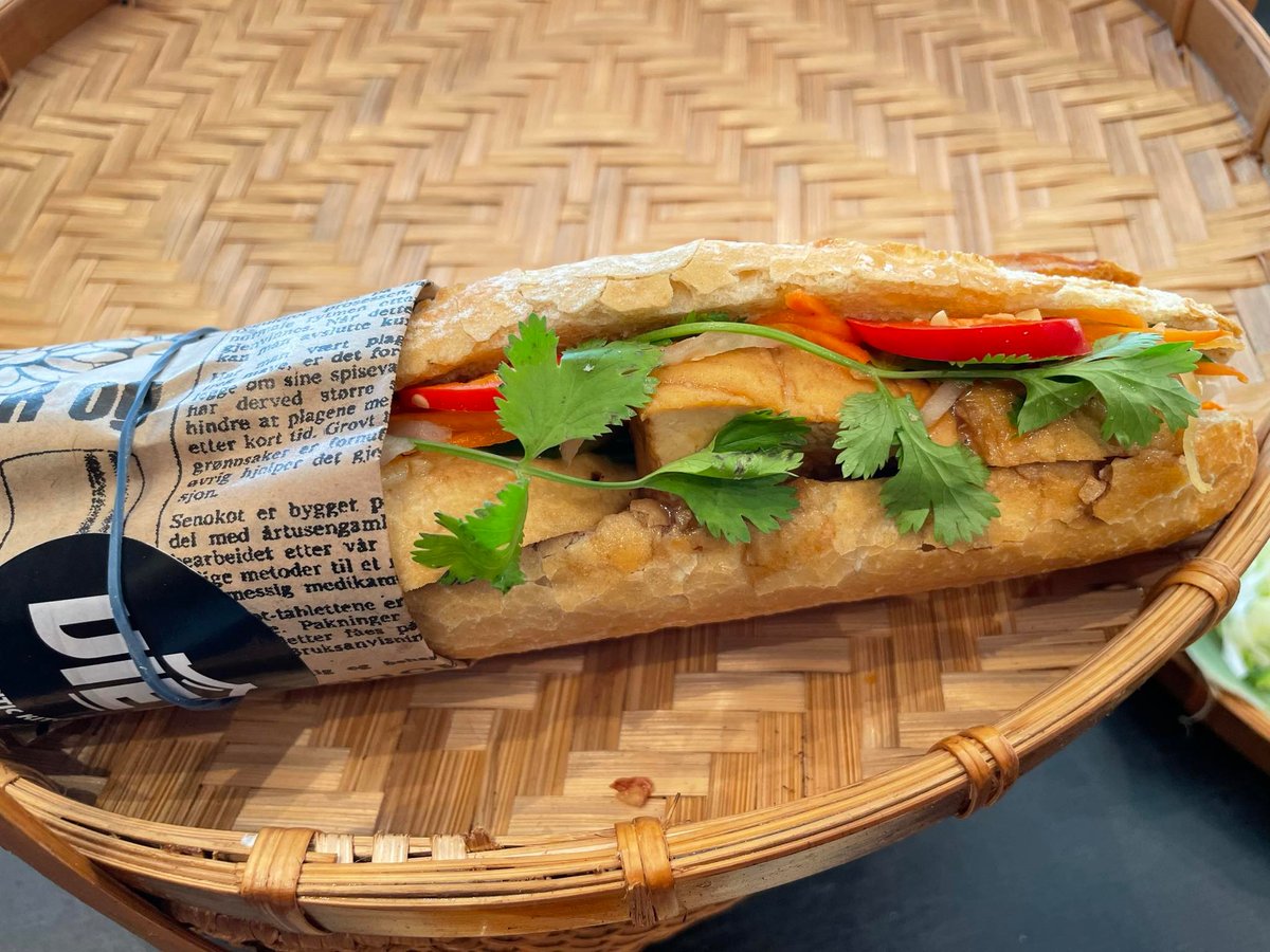 Vietnamesisk baguette med stekt tofu, syltede gulrøtter og reddik, koriander, agurk og soya.