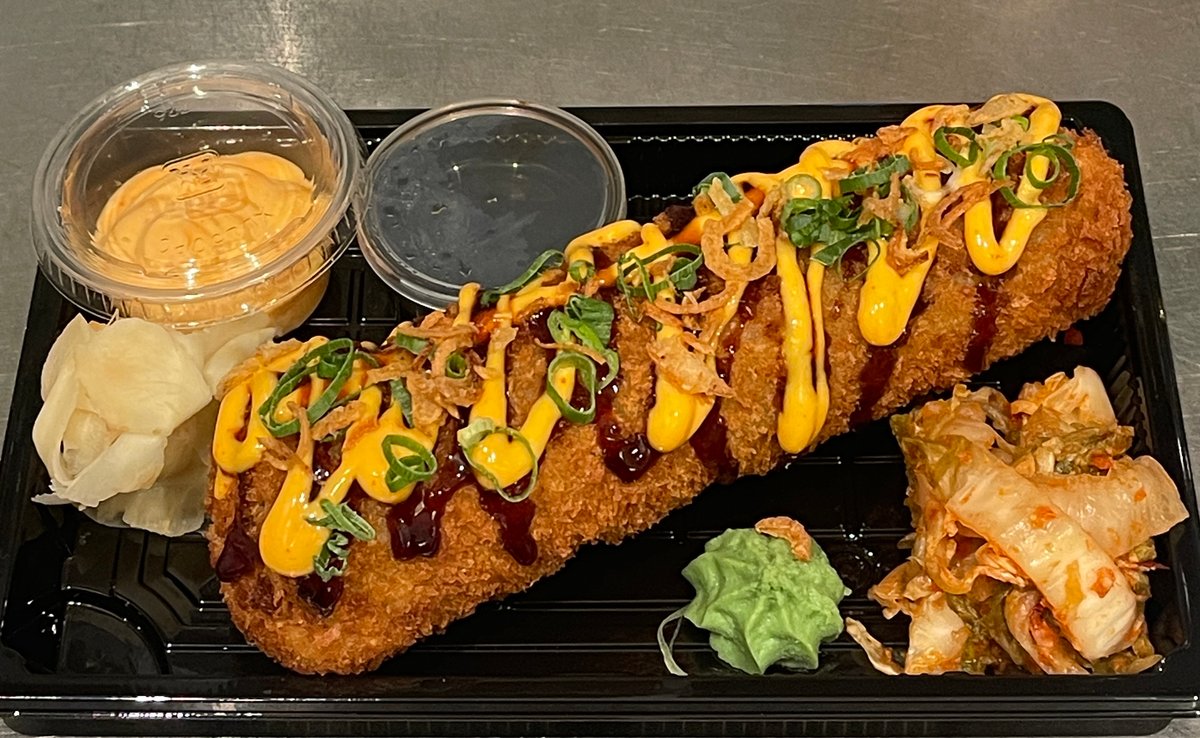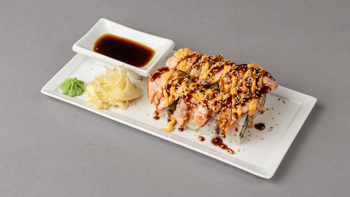 Hel frityrstekt maki med laks, avokado med laks, philadelifia, avocado, ris, sesam, vårløk, toppet med chilimajones og teriyakisaus.