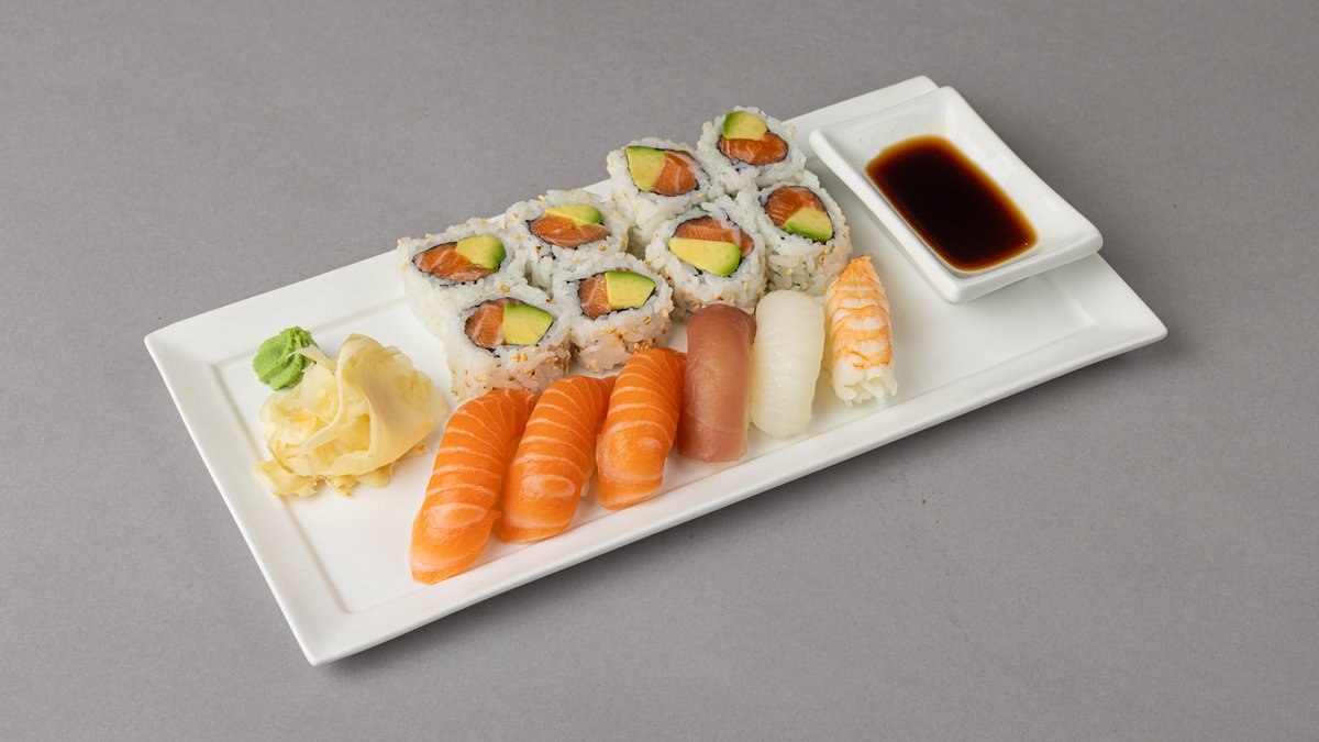 14 biter. Nigiri: 3 laks, 1 tunfisk, 1 kveite, 1 scampi Maki: 8 laks med avokado