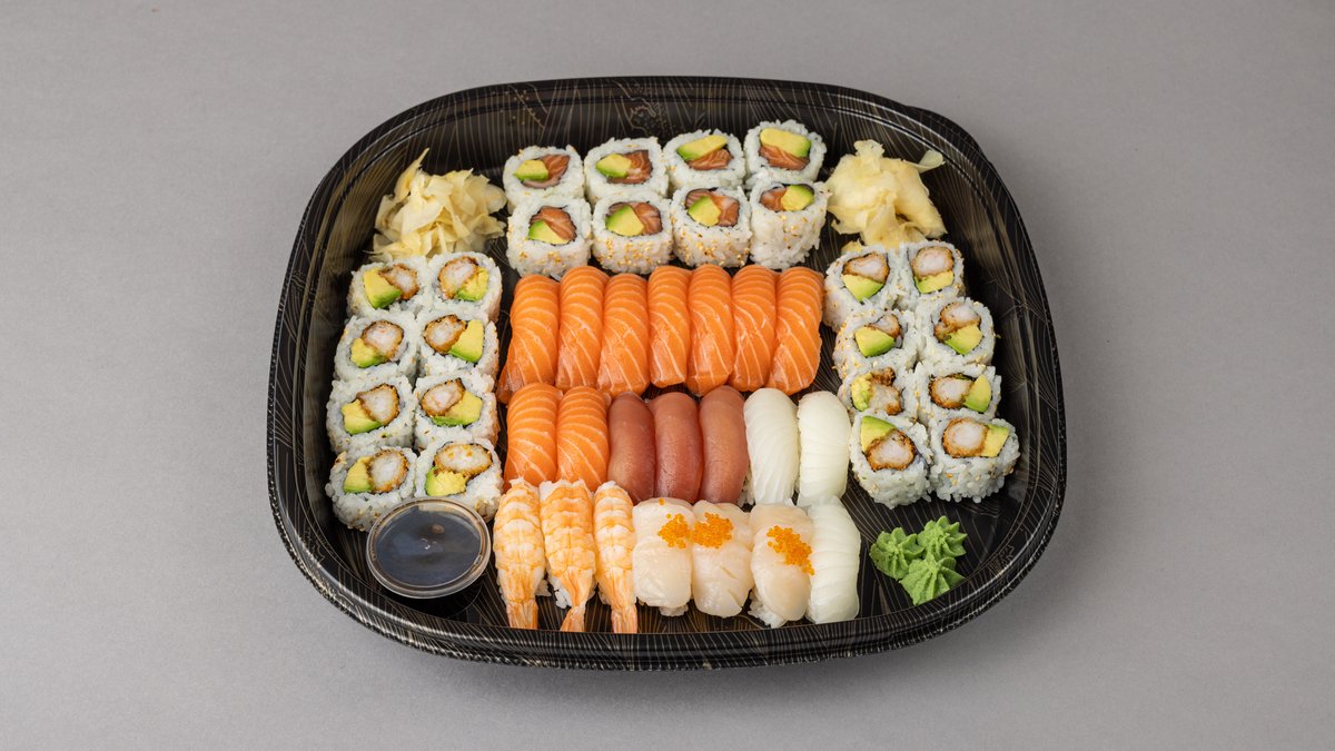 60 biter. Nigiri: 16 laks, 3 tunfisk, 3 kveite, 3 kamskjell, 3 scampi. Maki: 16 laks maki, 16 tempura scampi.