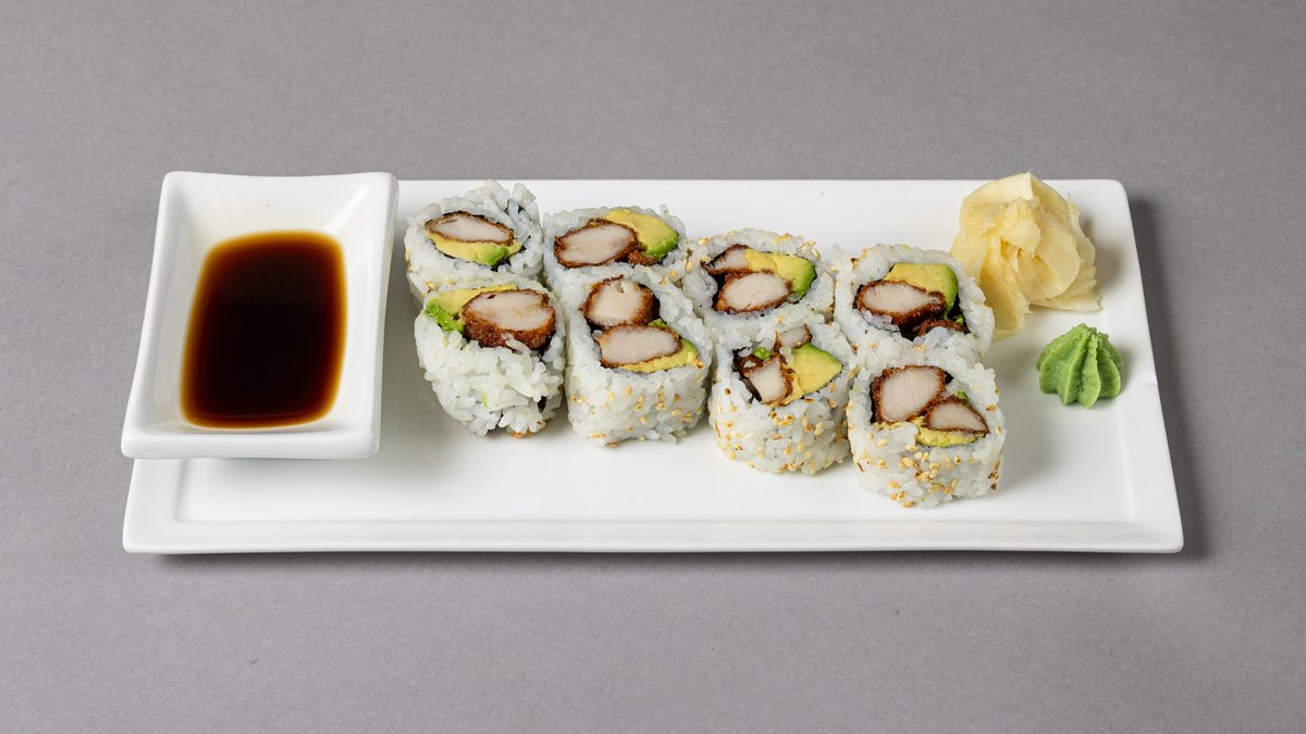 12 store biter. Tempura scampi, laks, tobiko, avokado, agurk, chilimajones.