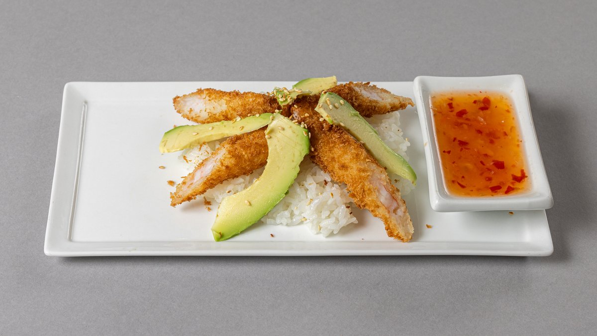 Fritert scampi, ris, avokado og søt chilisaus.