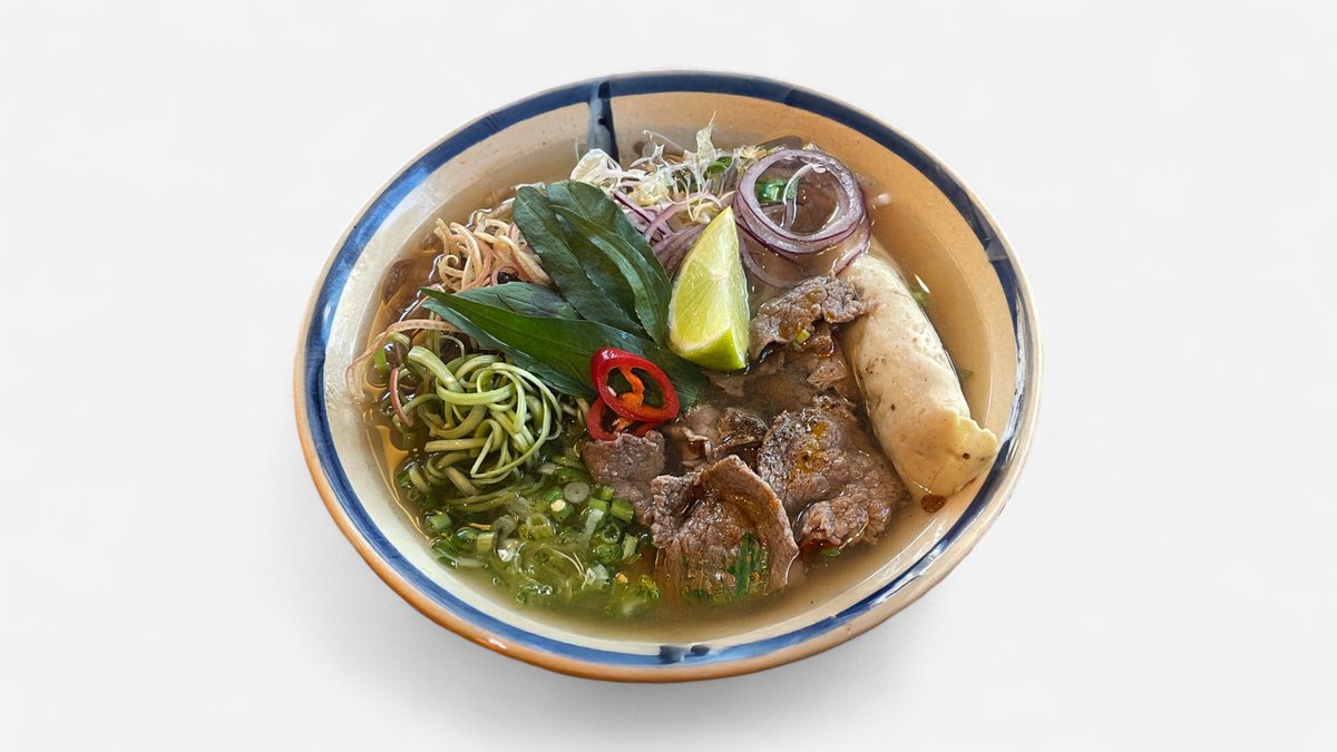 Tradisjonell vietnamesisk nudelsuppe fra Hue. Inneholder risnudler, mørt storfekjøtt i en krydret, aromatisk kraft. Smaksatt med sitrongress, chili og reke-pasta. Serveres med friske urter og bønnespirer.