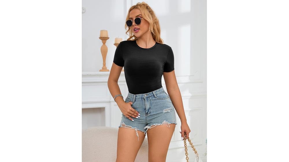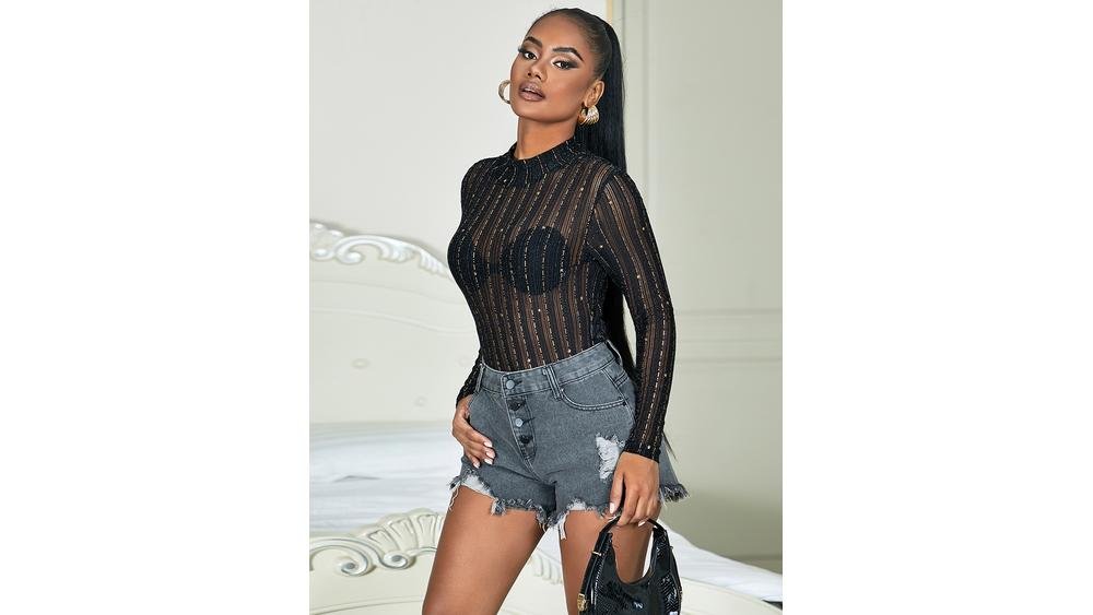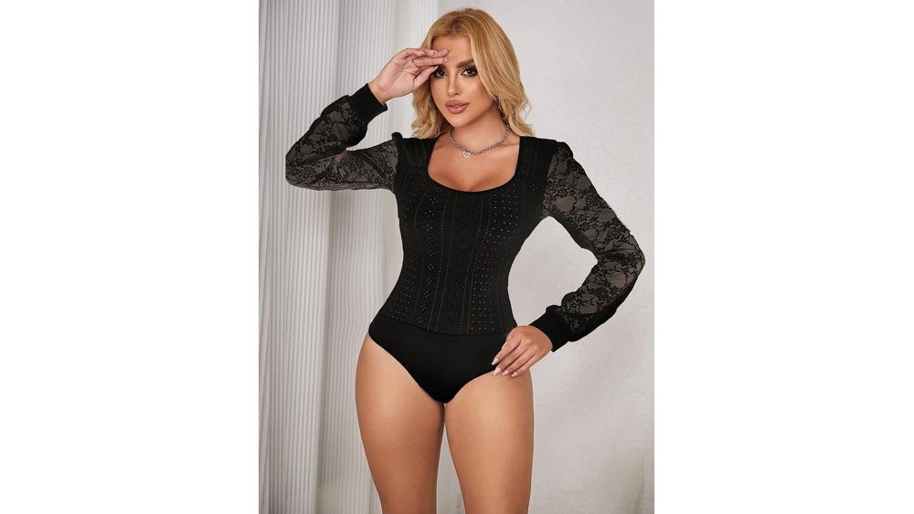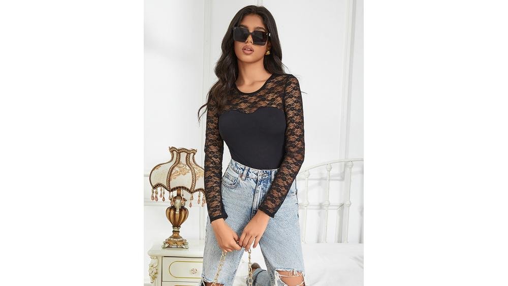 Svart Elegant Langermet Mesh Bodysuit med Blonder