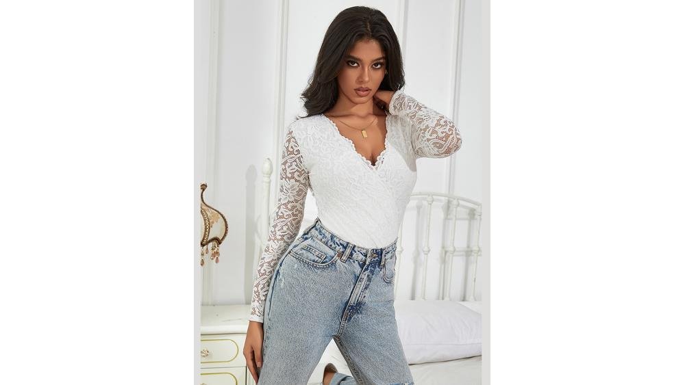 Hvit Elegant Langermet Mesh Bodysuit med Blonder