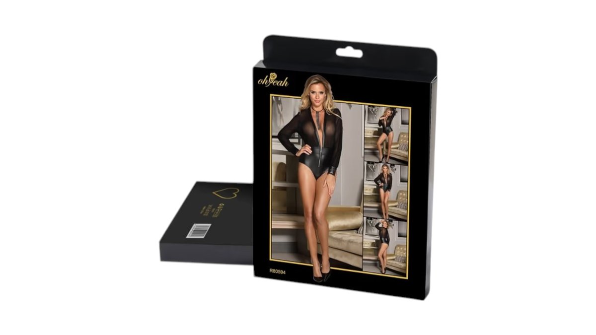 Black Sexy Long-Sleeve Hollow Cut Bodystocking Set