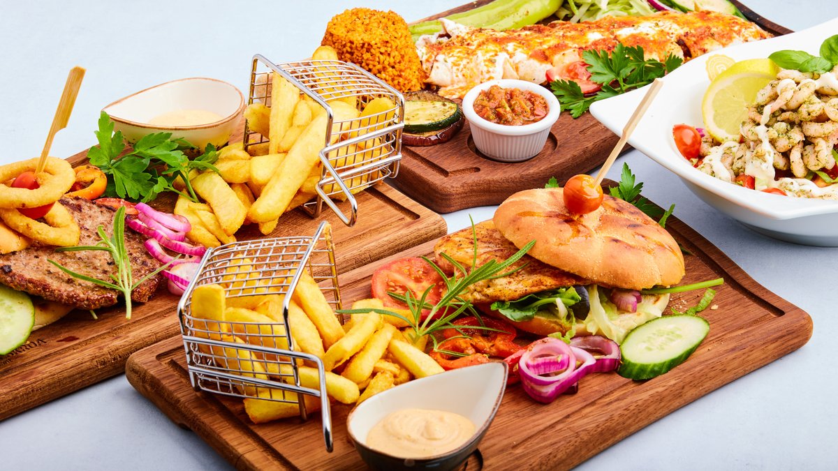 Spyd med indrefilet av okse og 2 spyd med kyllingfilet. Serveres med bulgur, tzatziki og salat.
