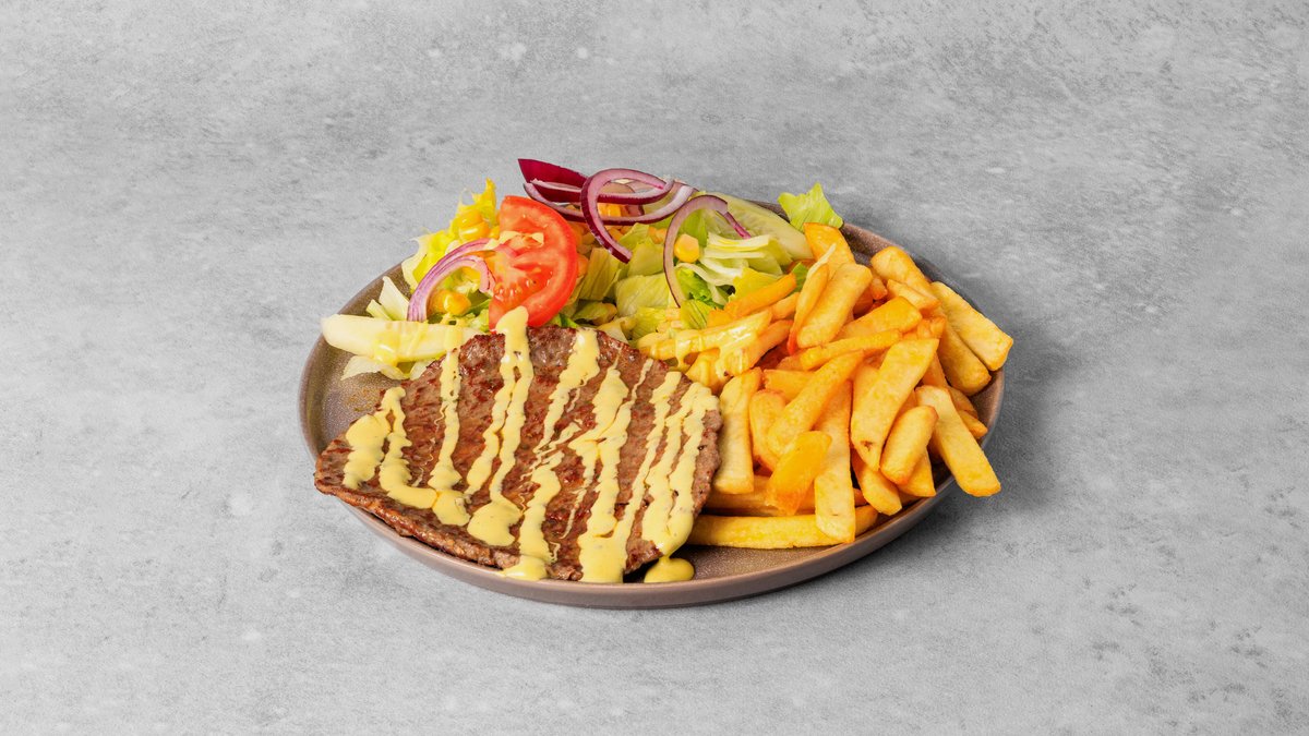 Pizza med tomatsaus, ost, hvitløk, chili-marinert biff, løk, paprika og oregano.