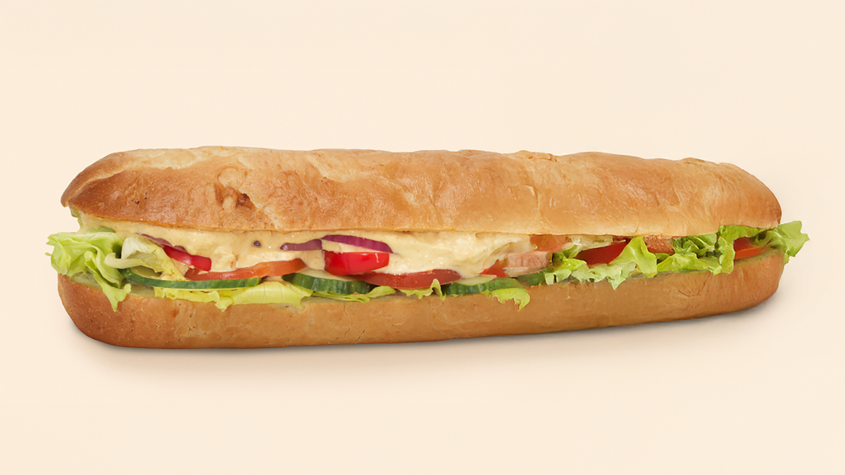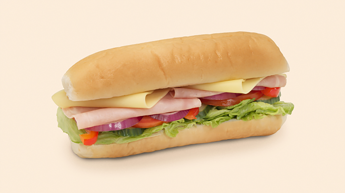 Hel sub fylt med ost, skinke, et friskt utvalg av grønnsaker og majones. Anbefales med ekstra ost, skinke og tortillachips