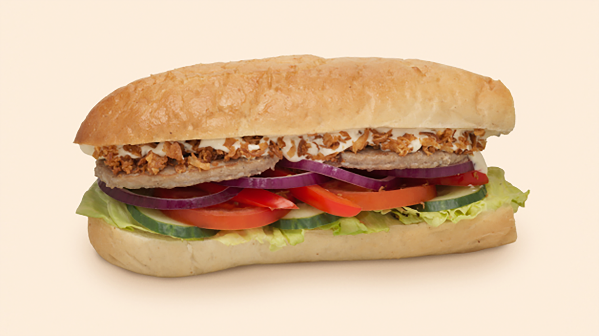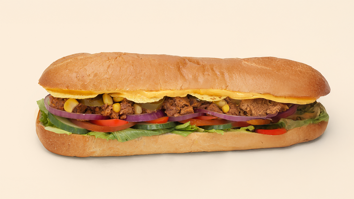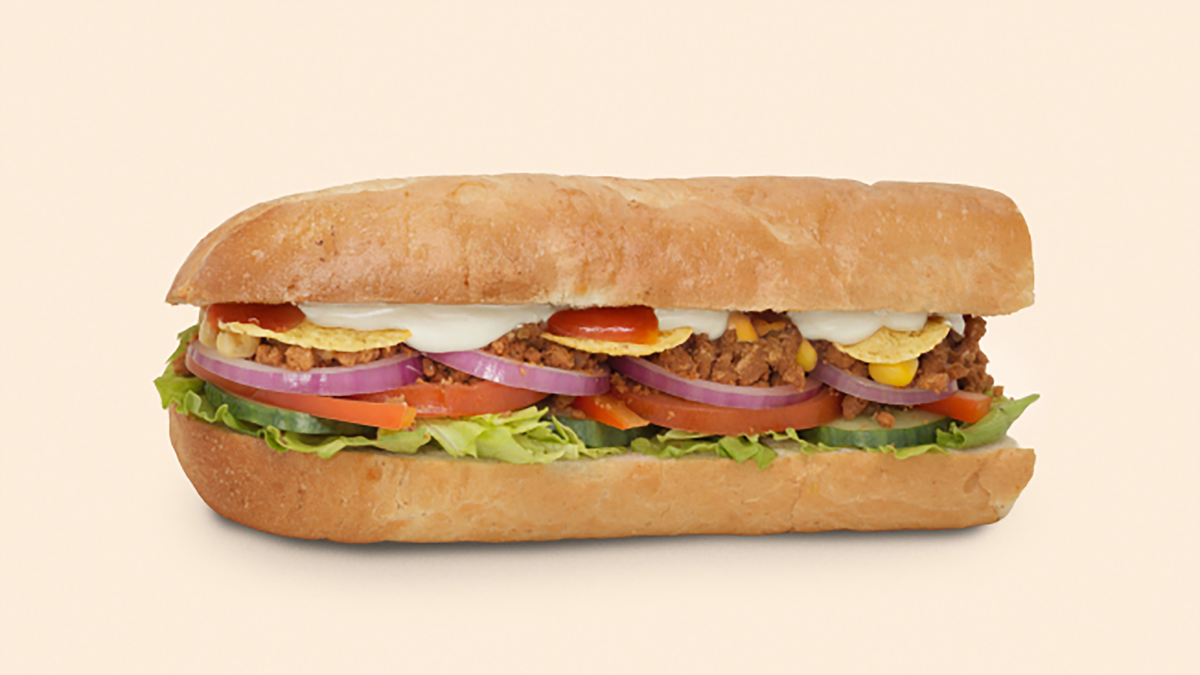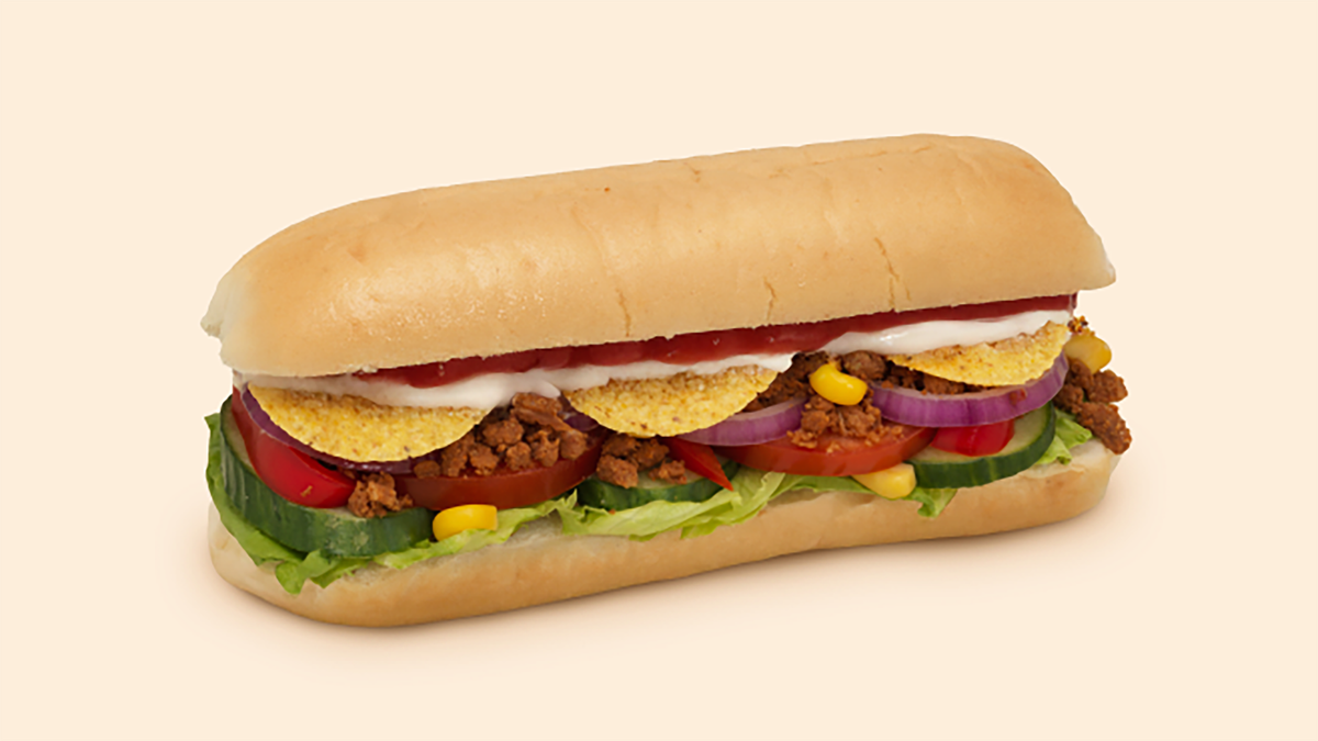 Halv sub med et meksikansk krydret plantebasert protein, massamandressing, og et friskt utvalg av grønnsaker. Anbefales med ekstra plantebasert protein, fetaost/ost og tortillachips.