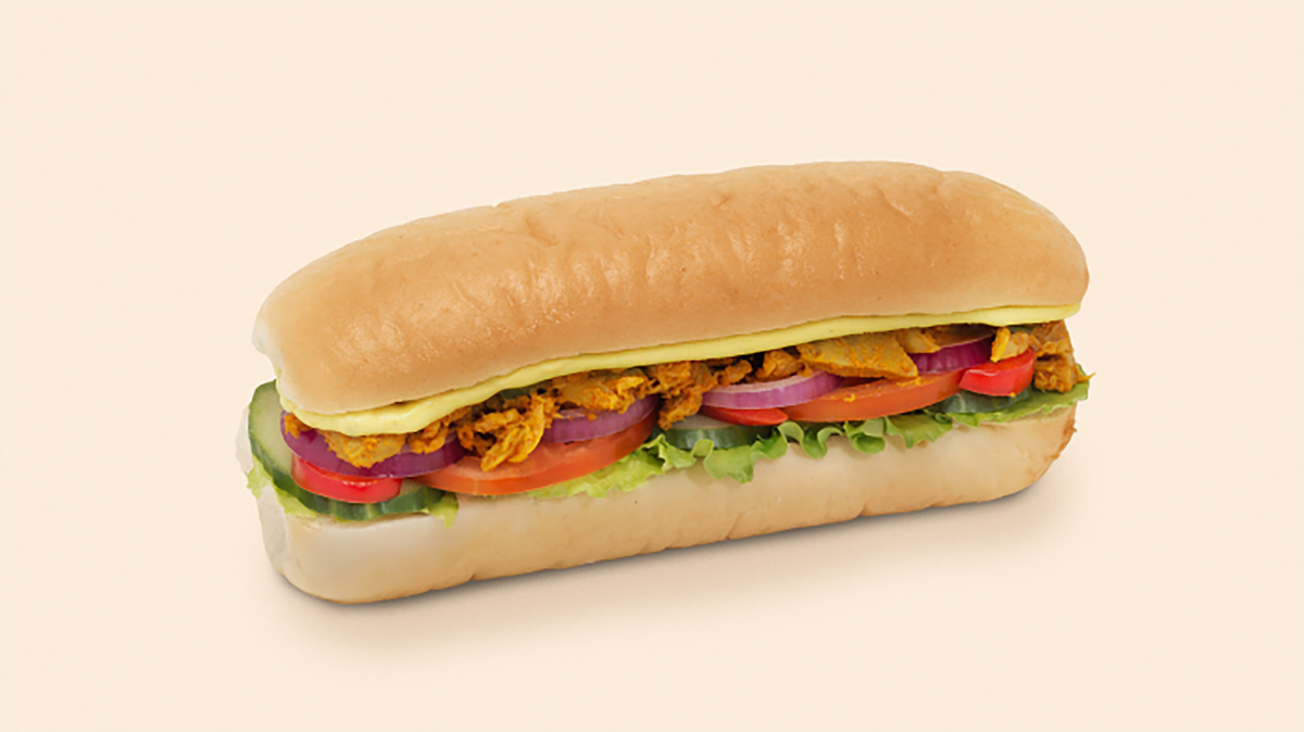 Halv sub fylt med en smøresalat av kylling karri og et friskt utvalg av grønnsaker. Anbefales med ost og tortillachips.