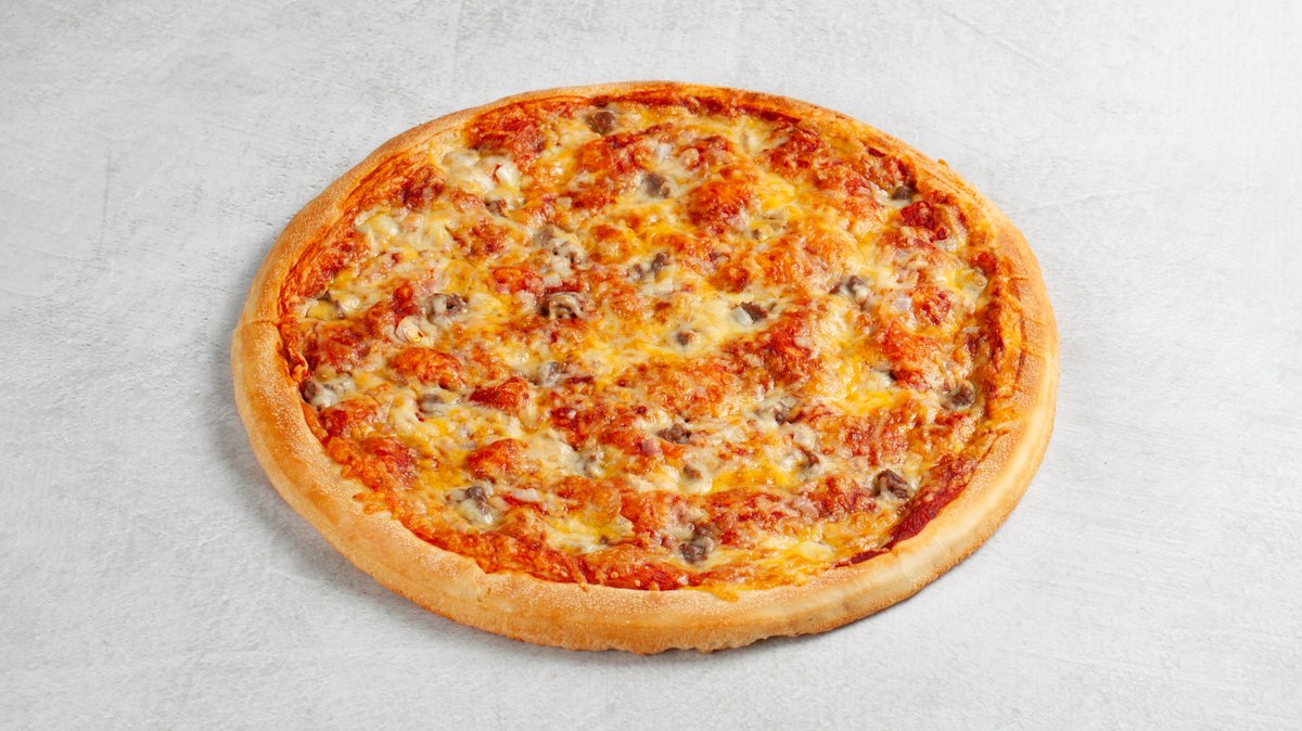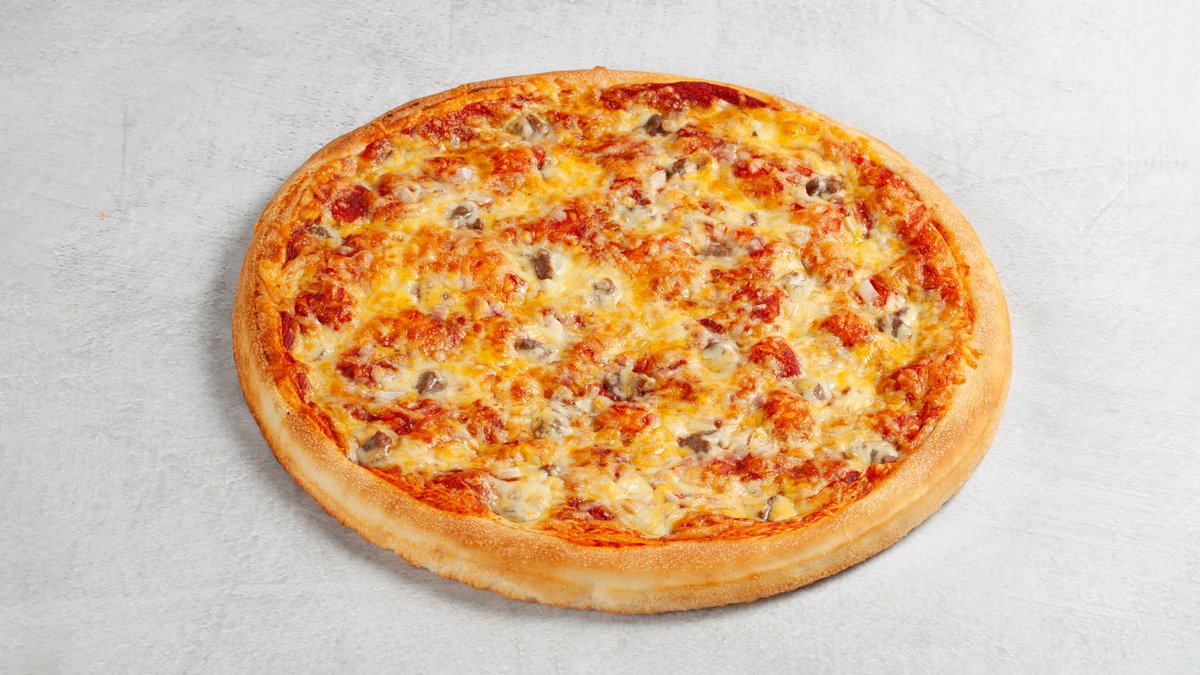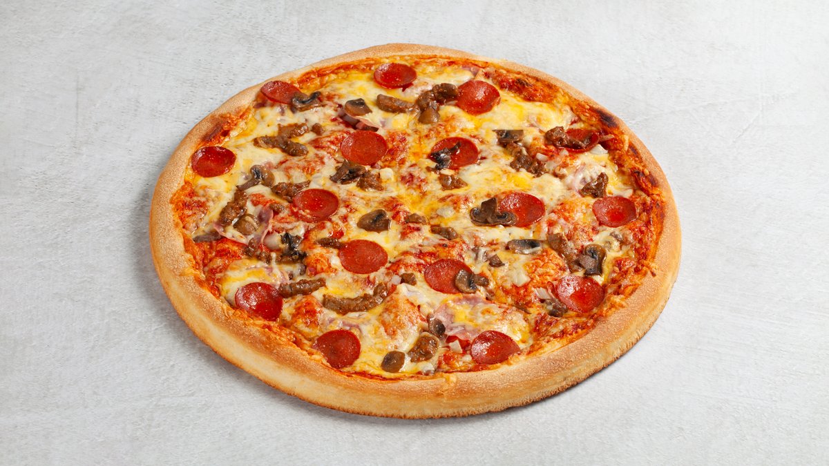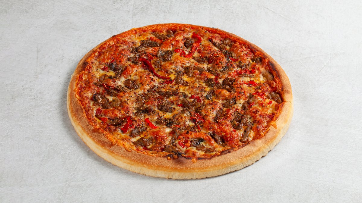 Dolly´s tomatsaus og osteblanding, marinert biffkjøtt, pepperoni, skinke, bacon, kjøttdeig, løk og bakt sjampinjong.