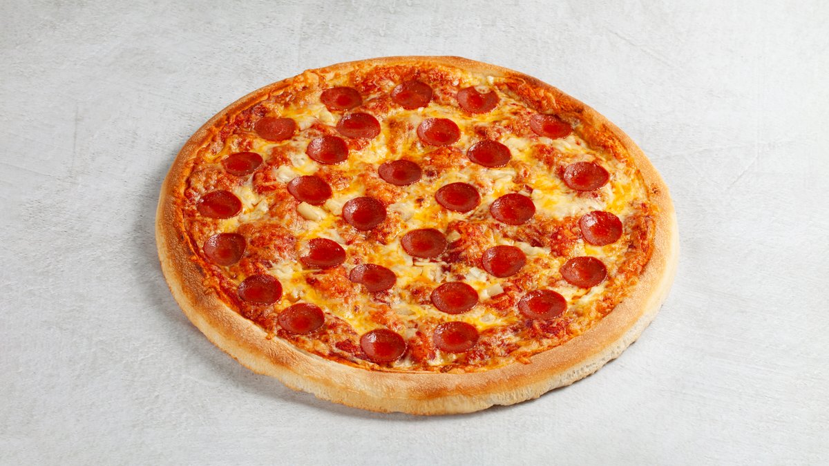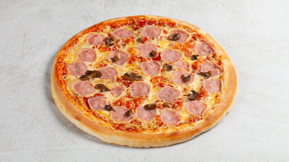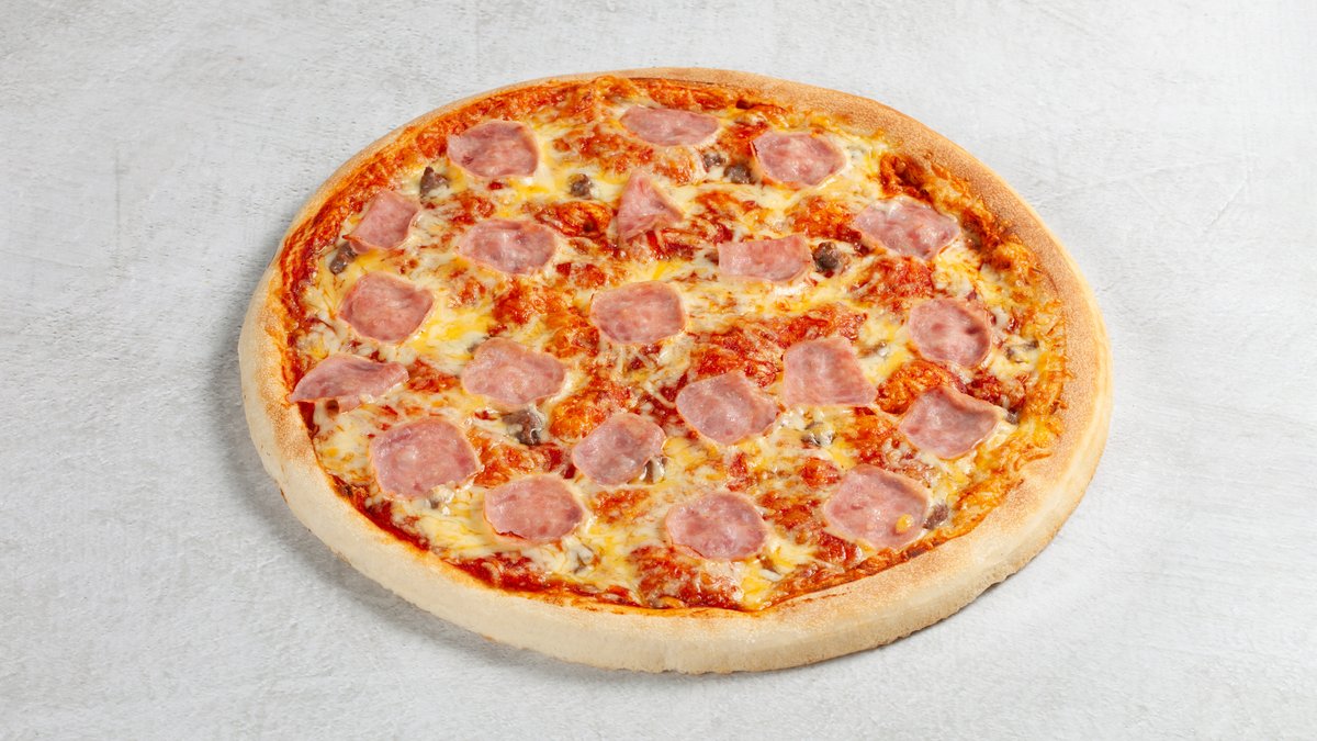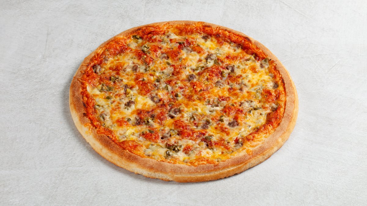 Dolly´s tomatsaus og osteblanding, marinert biffkjøtt, pepperoni, skinke, bacon, kjøttdeig, løk og bakt sjampinjong.