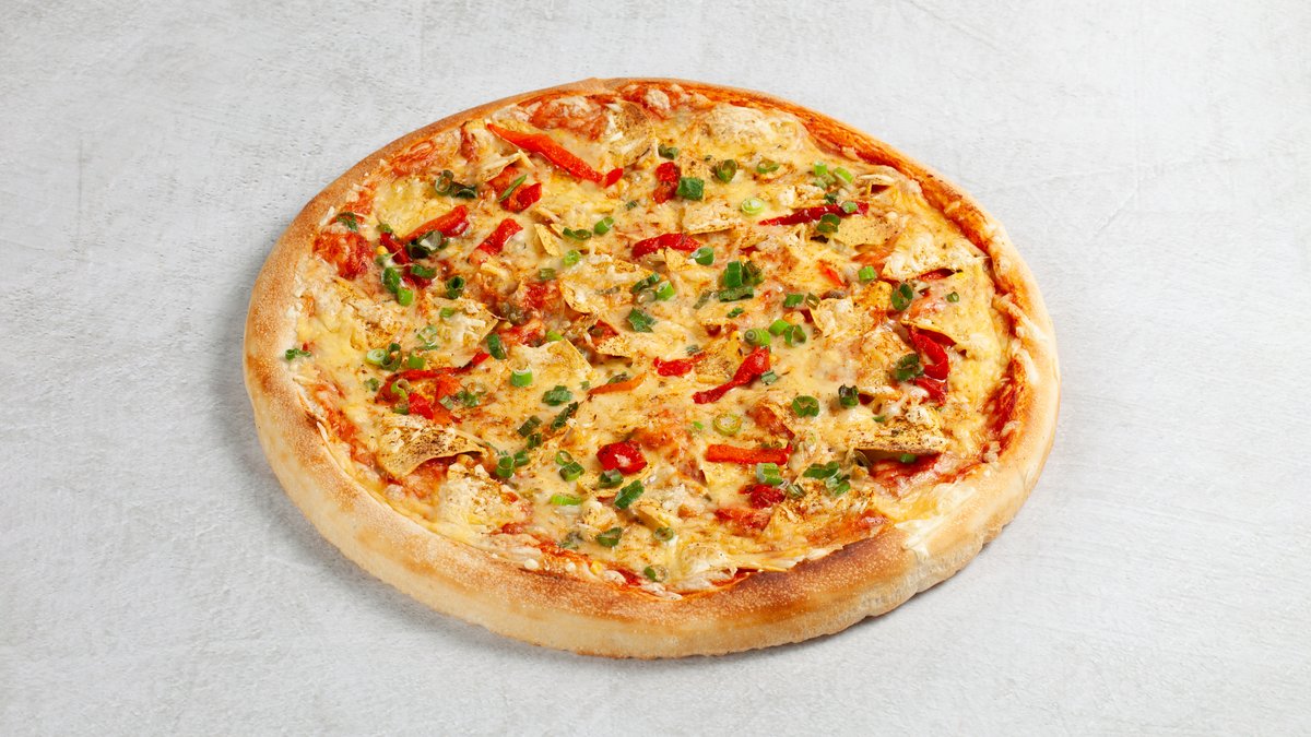 Dolly's tomatsaus, vegansk osteblanding, ananas, paprika, vårløk, løk, jalapeños, nachos-chips og mais.